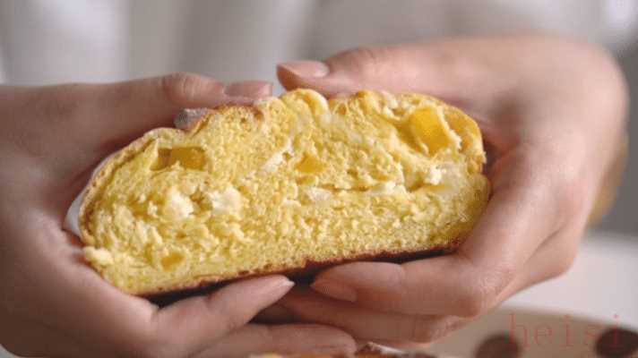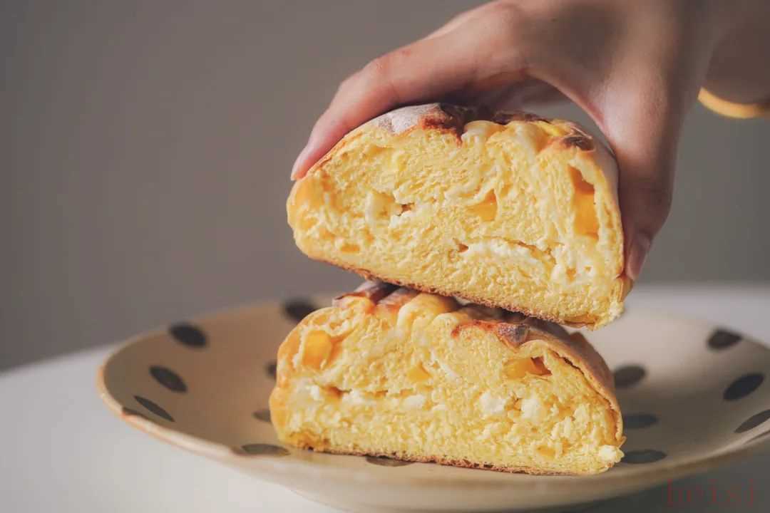 優(yōu)鮮芒果乳酪金黃的面包里是滿是糖漬芒果和乳酪塊,有甜美的香味~