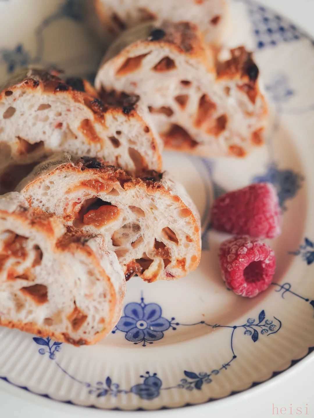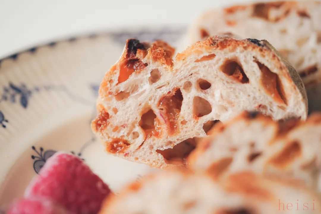 面團(tuán)使用魯邦液種和紅酒種隔夜發(fā)酵,并且加入了浸泡玫瑰花的水,香氣細(xì)膩??诟性鷮?shí),但不會(huì)難咬。細(xì)密的氣孔看著就好令人愉悅。