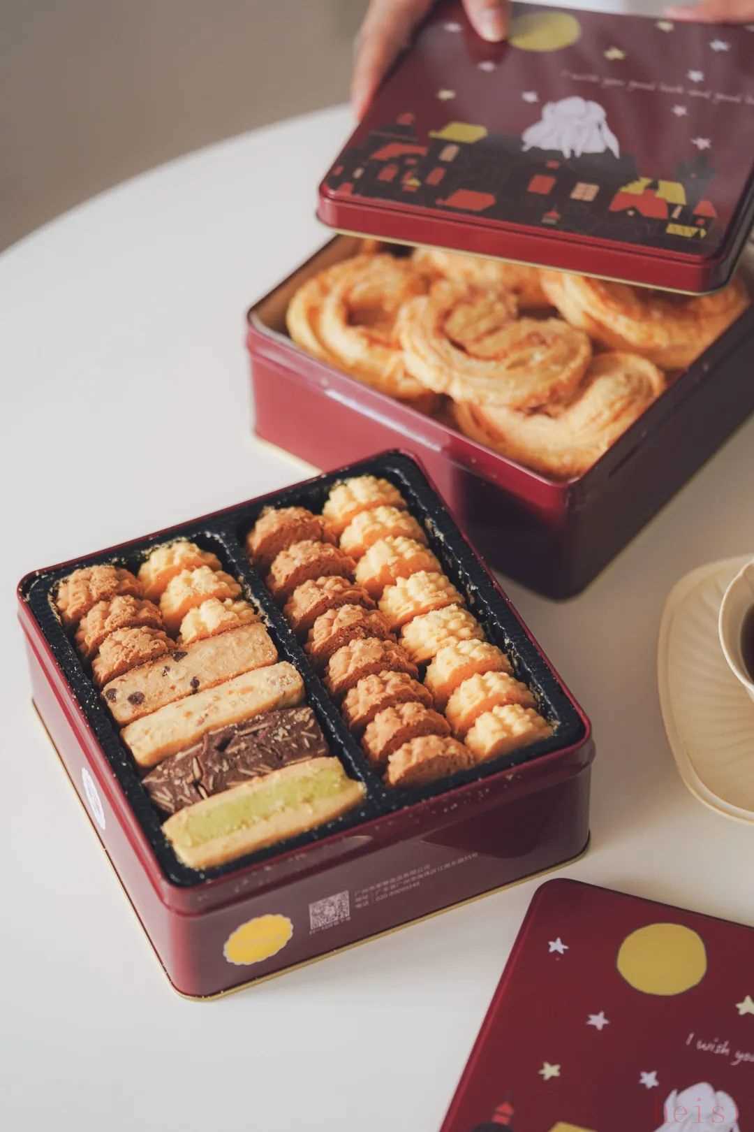 鐵罐包裝,一盒 10 種口味,全手工制作,酥酥香香的。