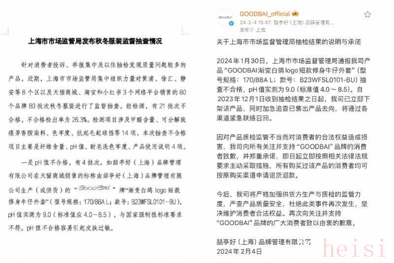值得一提的是,去年GOODBAI就曾被上海市市場(chǎng)監(jiān)管局通報(bào)過(guò)pH值不合格問(wèn)題,官方抽查通告顯示,GOODBAI旗下一款“漸變白鴿logo短款修身牛仔外套”pH值實(shí)測(cè)為9.0(標(biāo)準(zhǔn)值應(yīng)4.0~8.5),與國(guó)家強(qiáng)制性標(biāo)準(zhǔn)要求不符。而pH值不合格容易引起皮膚過(guò)敏。