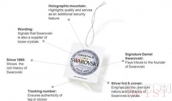 除與傳統(tǒng)印章一樣提供正品品質(zhì)的證明外,「采用施華洛世奇元素」同時(shí)為每件產(chǎn)品注入獨(dú)有魅力。此印章結(jié)合了防偽性極高的全息技術(shù)與鍍銀效果,并印有「Crystals from Swarovski」、創(chuàng)始人丹尼爾?施華洛世奇(Daniel Swarovski)的簽名,以及公司成立年份「Since 1895」,彰顯出品牌豐富而悠久的歷史﹔采用各種最新式的安全特性、配合具有驗(yàn)證功能的追蹤編號(hào),完美體現(xiàn)出施華洛世奇?zhèn)鞒兄两竦膭?chuàng)意文化、專(zhuān)業(yè)知識(shí)以及尊貴地位。