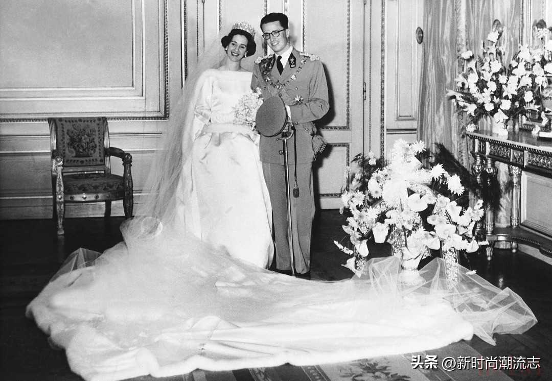 比利時(shí)博杜安國(guó)王與身穿 Balenciaga 婚紗的法比奧拉王后,1960年