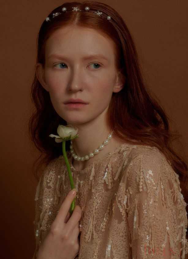 珍珠發(fā)夾別在一邊耳朵旁,搭配溫柔的半透明網(wǎng)紗裙,笑起來(lái)好像都富有故事。