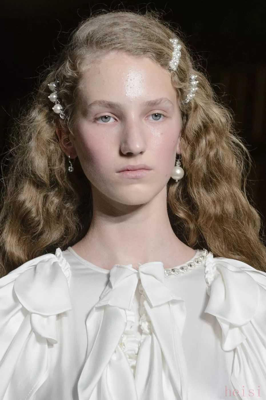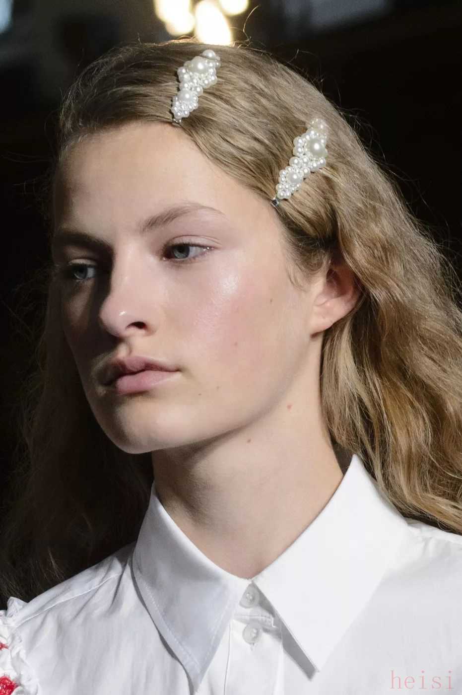 珍珠發(fā)夾幾乎是一夜回春,爬上了時(shí)髦女孩兒的腦門兒,而這場(chǎng)“Girlish Fashion”的源頭就是Simone Rocha 2018春夏時(shí)裝系列,各種浪漫的褶皺裙和刺繡造型全部都用了珍珠發(fā)夾裝飾。華麗褶皺的娃娃裙可能穿不了,但是BlingBling的珍珠發(fā)夾還是可以有啊。