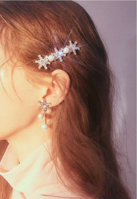 人造水晶發(fā)夾上點(diǎn)綴珍珠一閃一閃更加夢(mèng)幻,同系列的耳環(huán)也非常適合搭成一套一起佩戴。