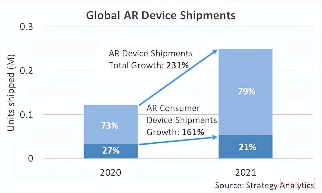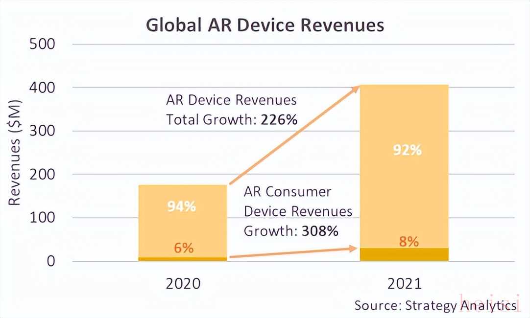 Strategy Analytics執(zhí)行總監(jiān)兼報告作者David MacQueen表示:“2020年到2021年間,消費級AR頭顯設(shè)備出貨量同比增長161%。同期,消費級AR頭顯設(shè)備營收的增長超過整體市場,同比增長超過300%?!?/p>