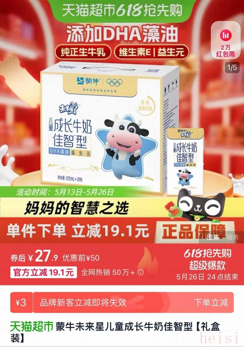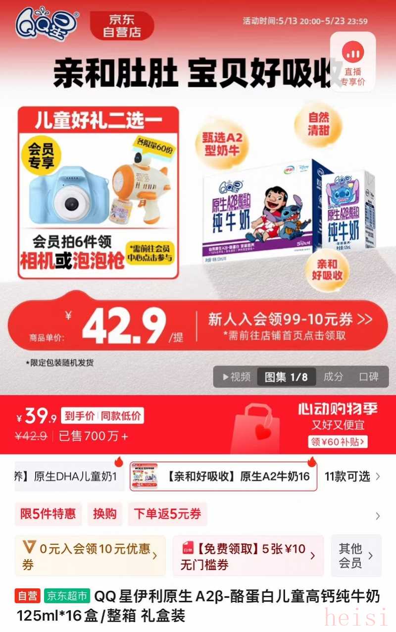 同樣規(guī)格的伊利QQ星A2兒童純牛奶16盒的售價為39.9元,單價也是2.5元,活動頁面顯示產(chǎn)品原價為42.9元;而16盒125ml的蒙牛未來星雙原生DHA兒童牛奶的售價為43.8元,單價約2.7元,活動頁面顯示產(chǎn)品原價為68.65元,相當于活動期間每盒降價1.6元左右。