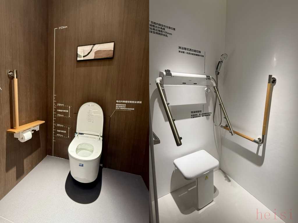 恒潔展出的可升降馬桶、洗面臺等,不僅提供了空間距離標注的整體方案,更在扶手等細節(jié)的設(shè)計上,努力使其樣式、位置和顏色與整體衛(wèi)浴空間更適配,弱化對使用者“需要被幫助”的年齡或身體狀況提醒,體現(xiàn)了對老年人尊嚴和心理需求的關(guān)懷。據(jù)現(xiàn)場工作人員介紹,目前恒潔該系列產(chǎn)品主要面向B端銷售。