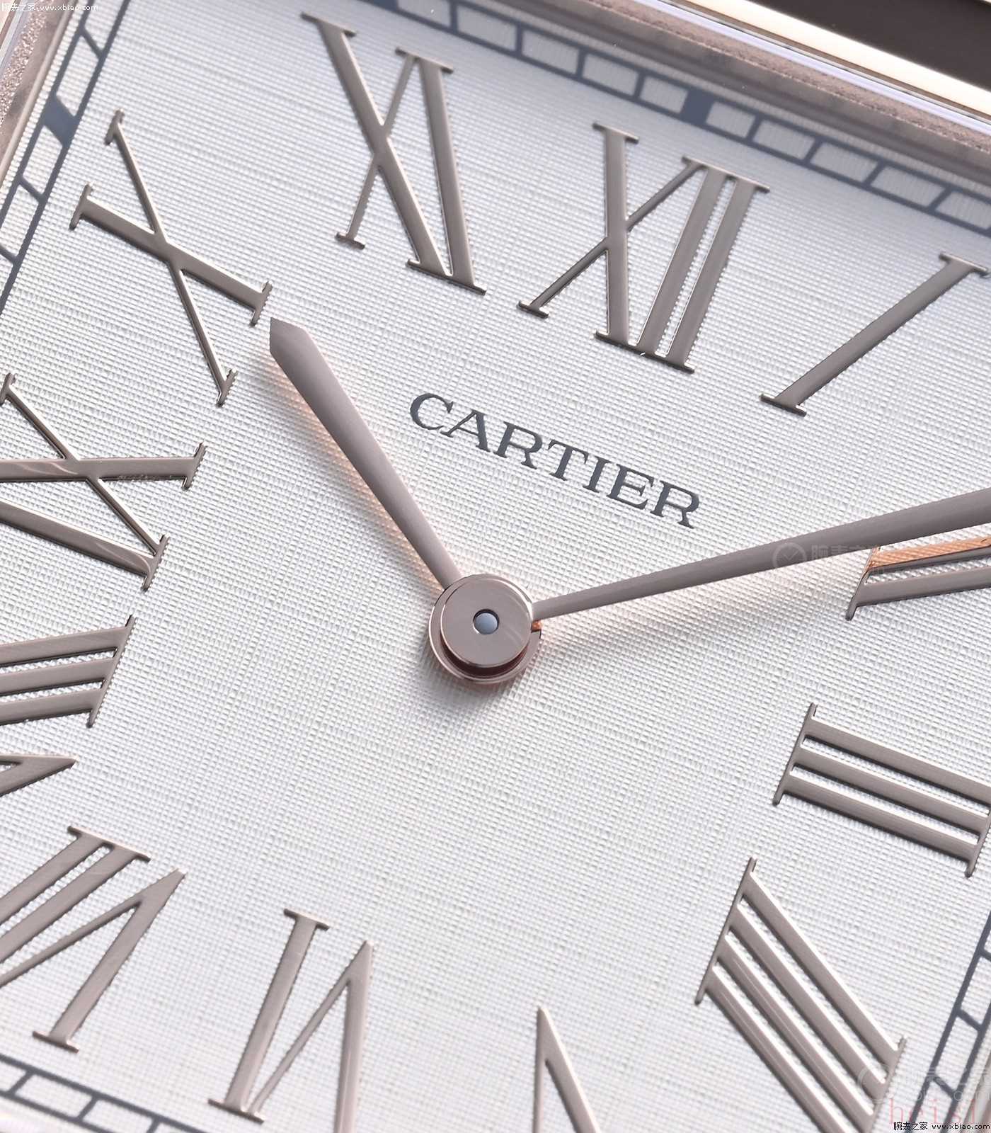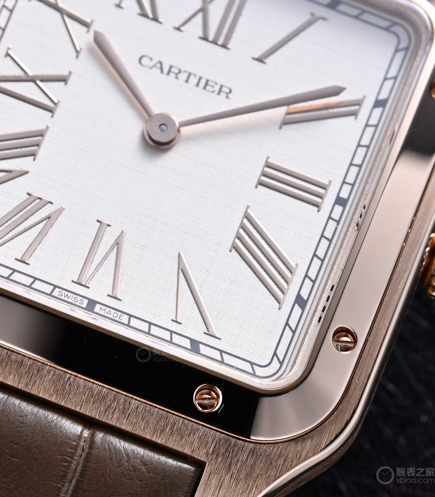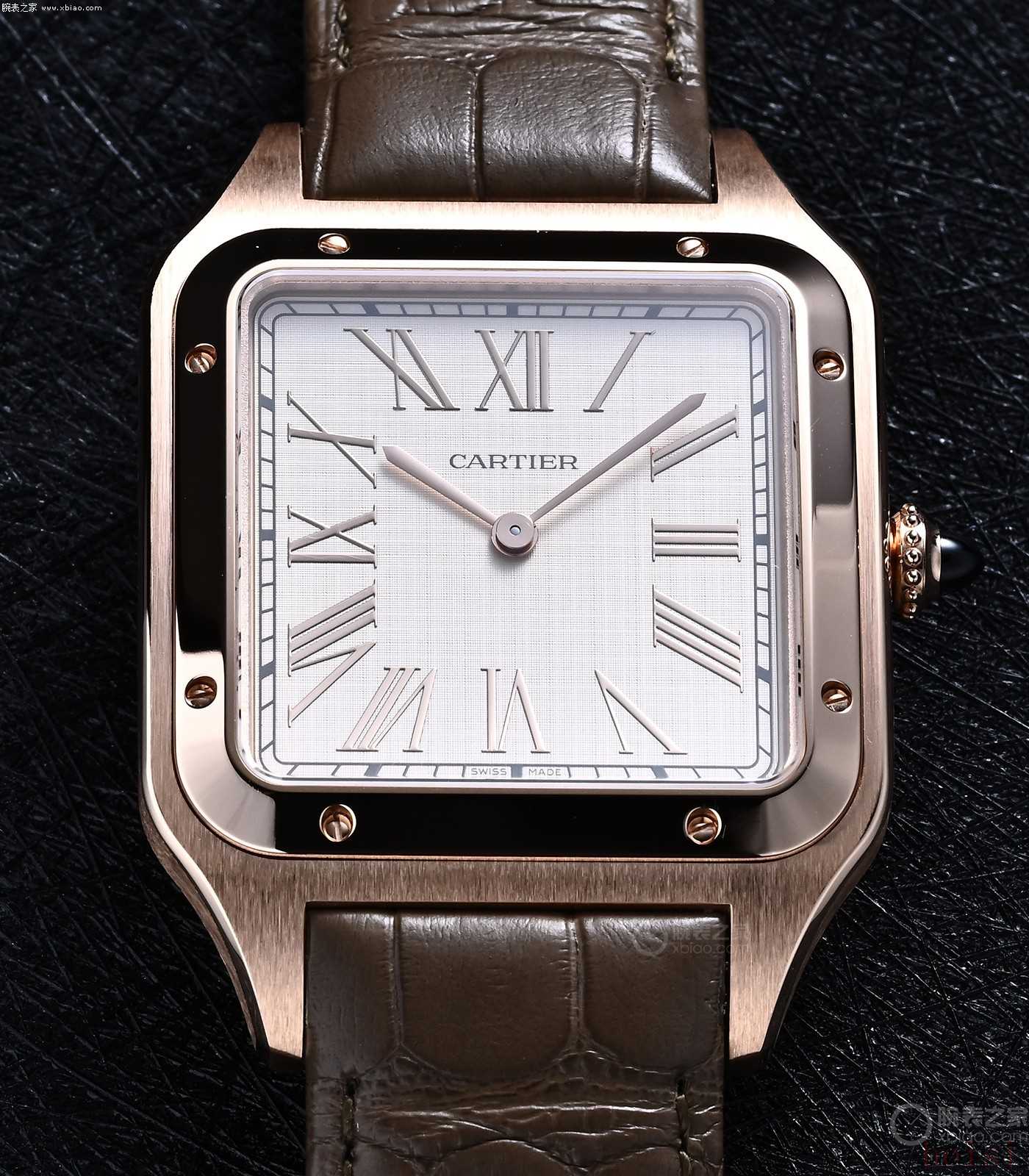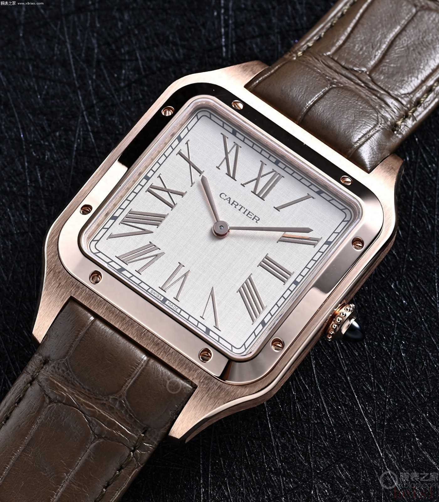 卡地亞山度士·杜蒙:正裝風(fēng)格、兩針表、表殼更?。ǚ浪?0米)、機械機芯型號使用手動上弦機芯、配皮表帶。