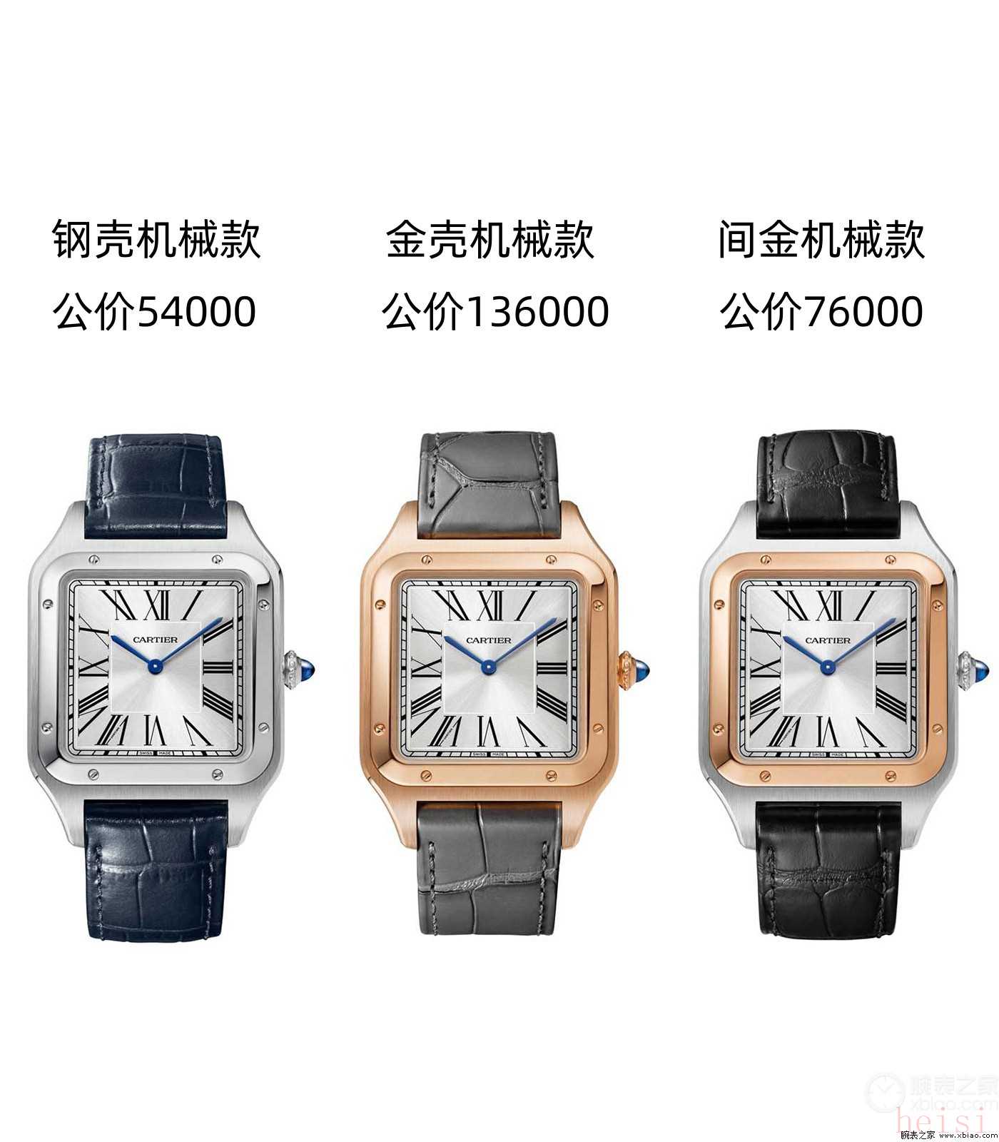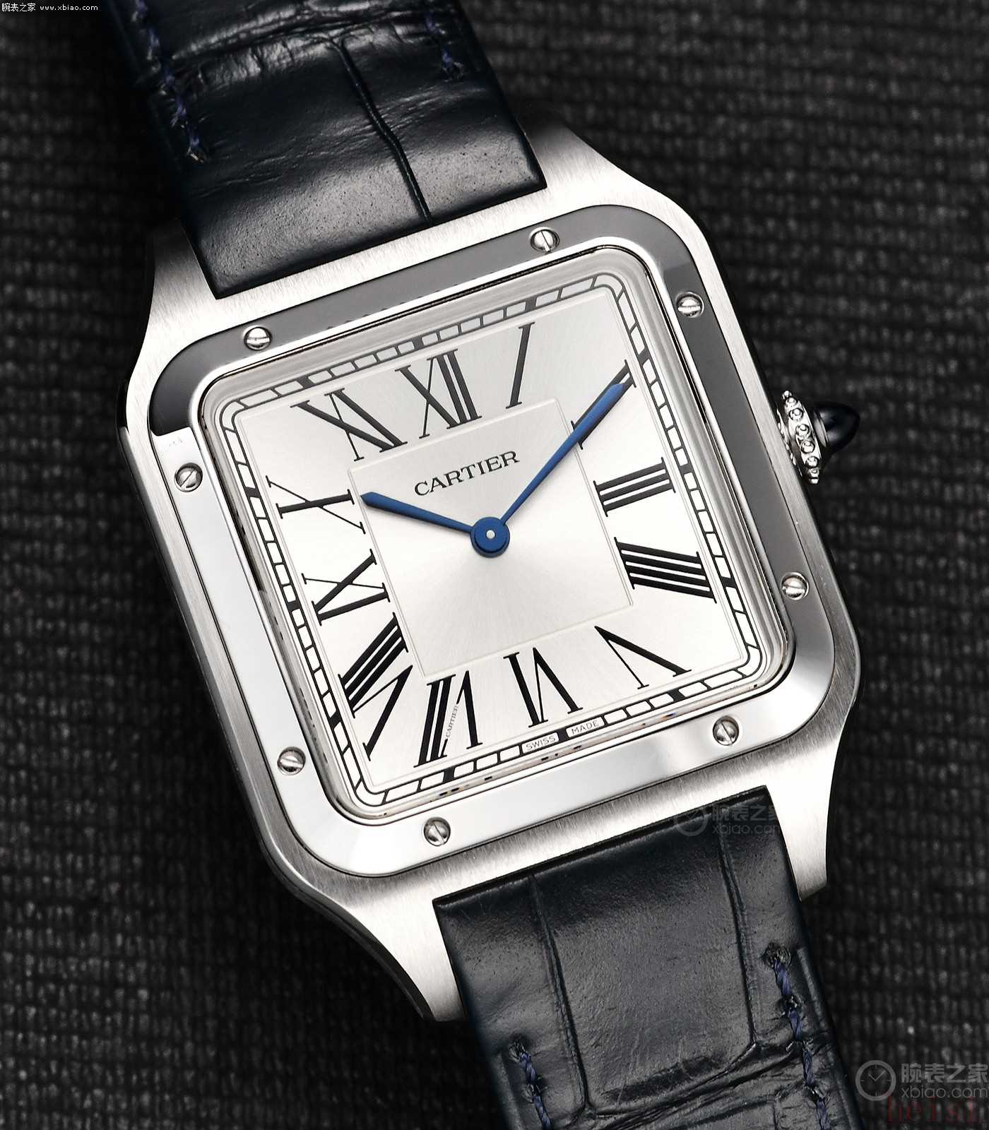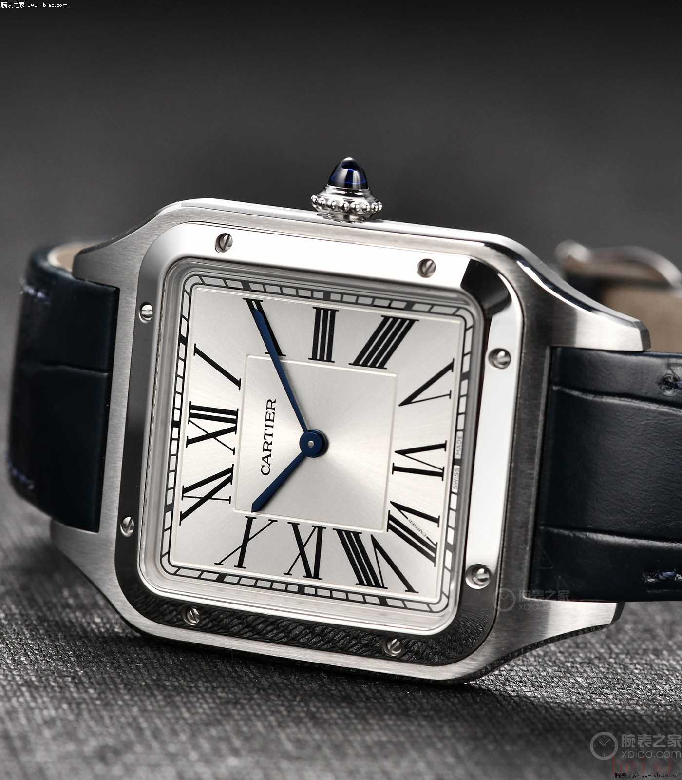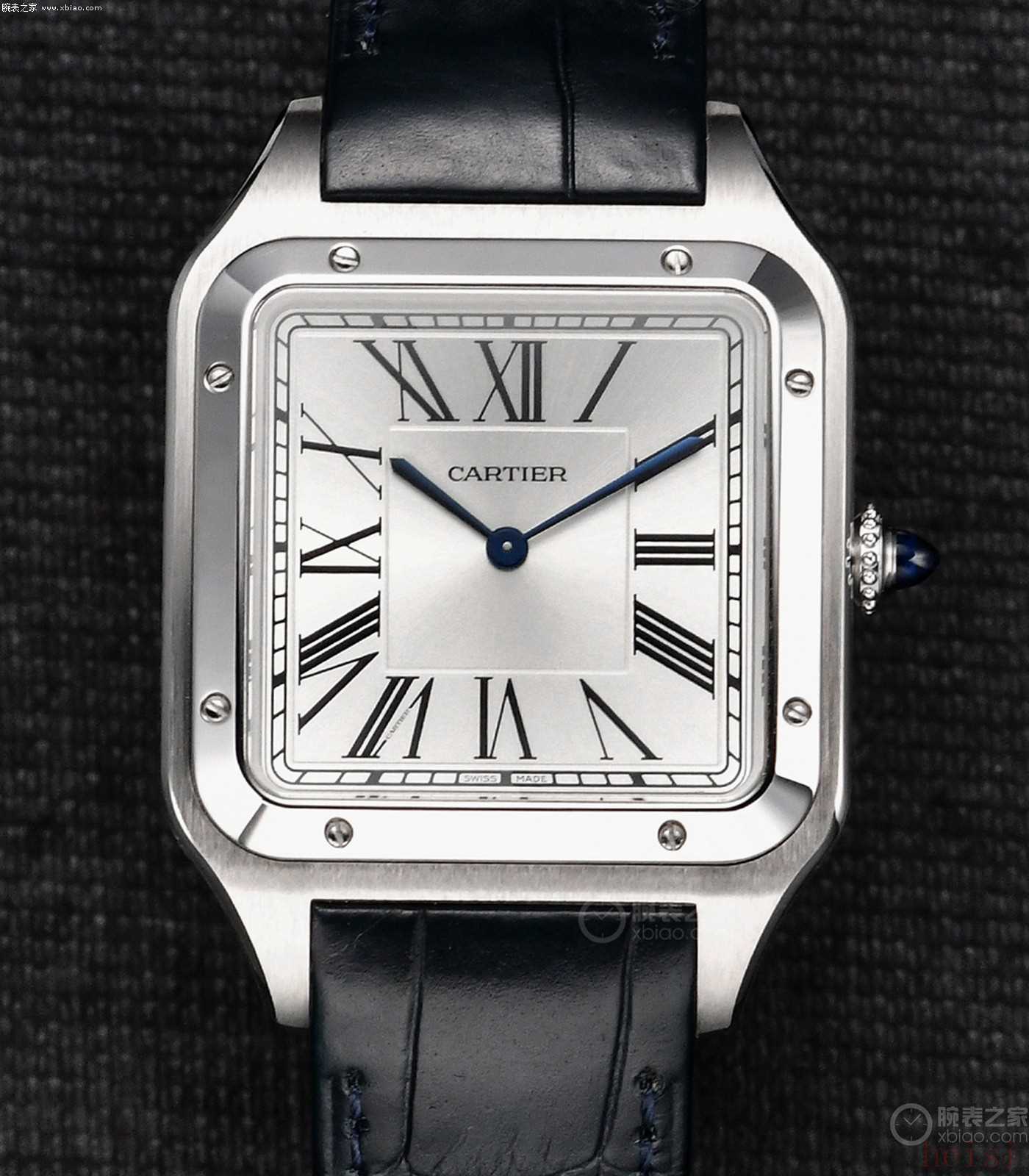 卡地亞山度士·杜蒙:正裝風(fēng)格、兩針表、表殼更?。ǚ浪?0米)、機械機芯型號使用手動上弦機芯、配皮表帶。