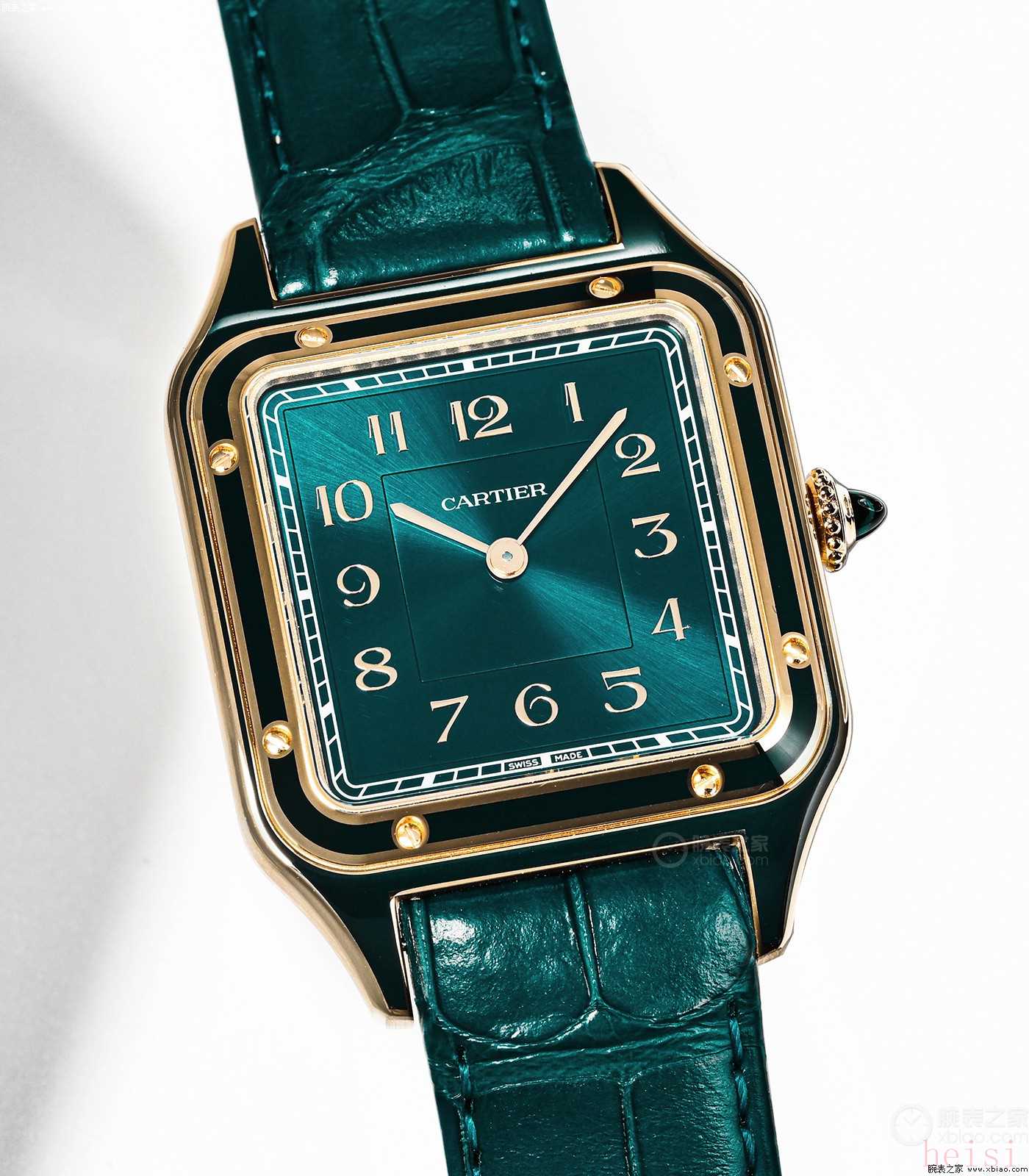 山度士·杜蒙“孔雀藍(lán)”,同樣使用卡地亞430MC手動上弦機芯。雖然不透底,在底蓋上,也刻有Santos-Dumont英文簽名。