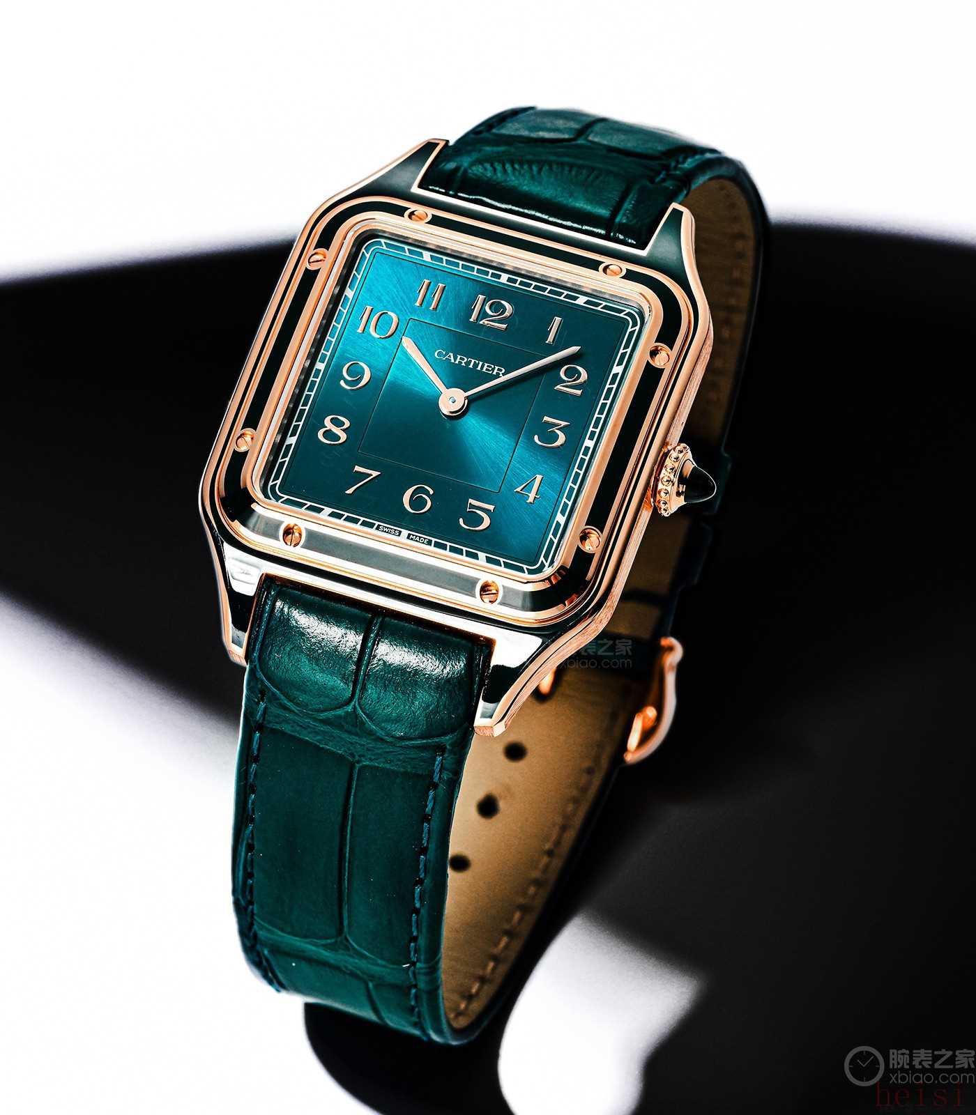 山度士·杜蒙“孔雀藍(lán)”,玫瑰金表殼,43.5毫米x 31.4毫米,屬于大號山度士,因為方形手表的尺寸是算上表耳的,實際表頭相當(dāng)于圓表35、36毫米,當(dāng)然這也是標(biāo)準(zhǔn)的正裝金表尺寸。
