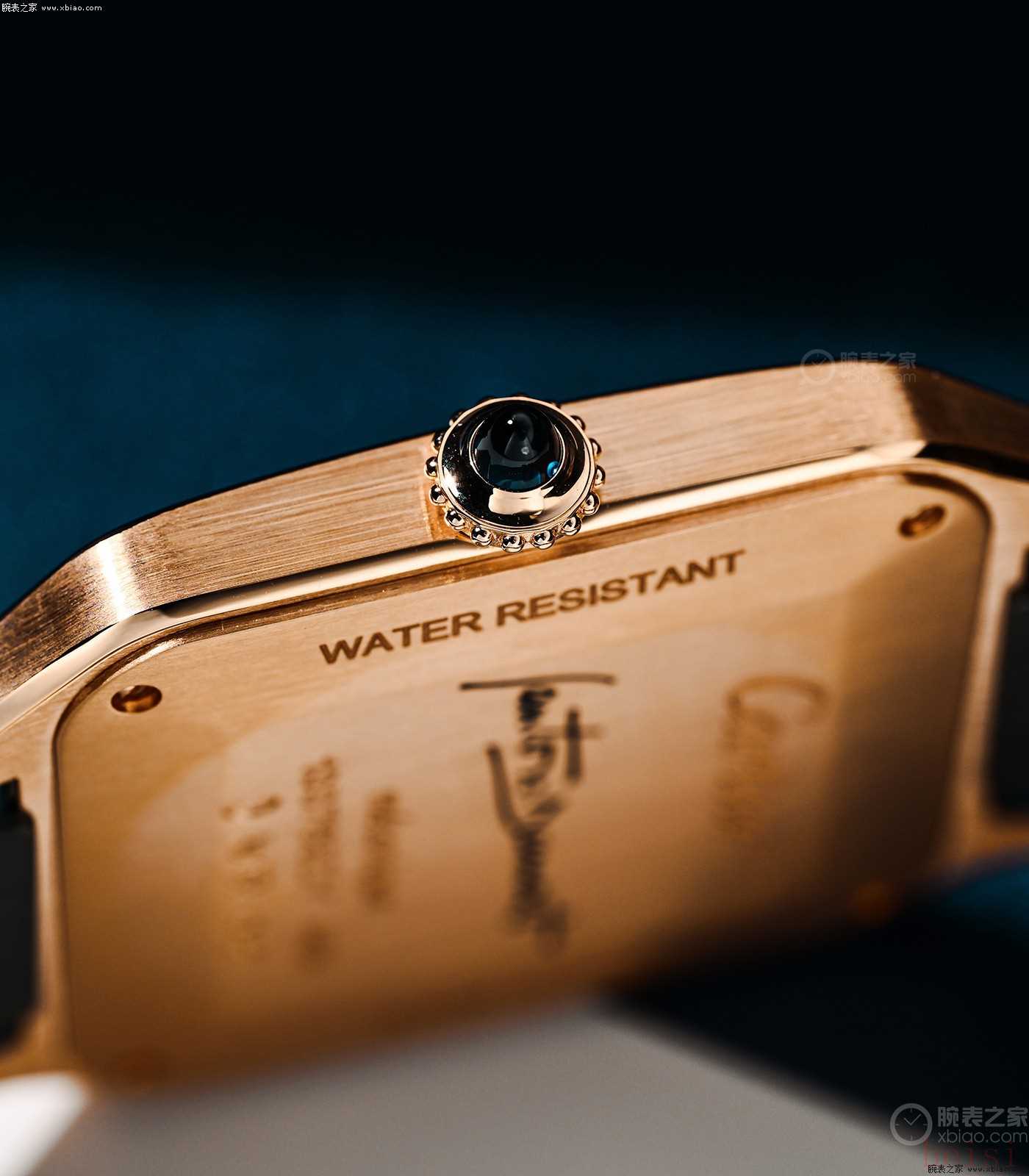 山度士·杜蒙“孔雀藍(lán)”,表冠和底蓋細(xì)節(jié)。