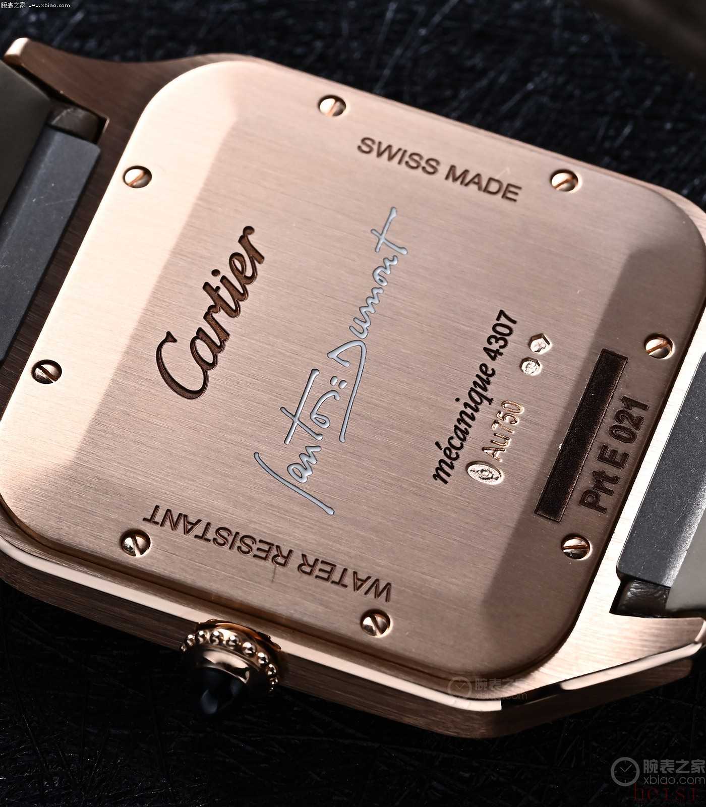 卡地亞山度士·杜蒙是不透底的。但在手表底蓋上,刻有手寫體的Santos-Dumont英文簽名。其中間金款,雖然表殼是鋼的,但在底蓋上,也放上了一小條實金金條,作為裝飾。