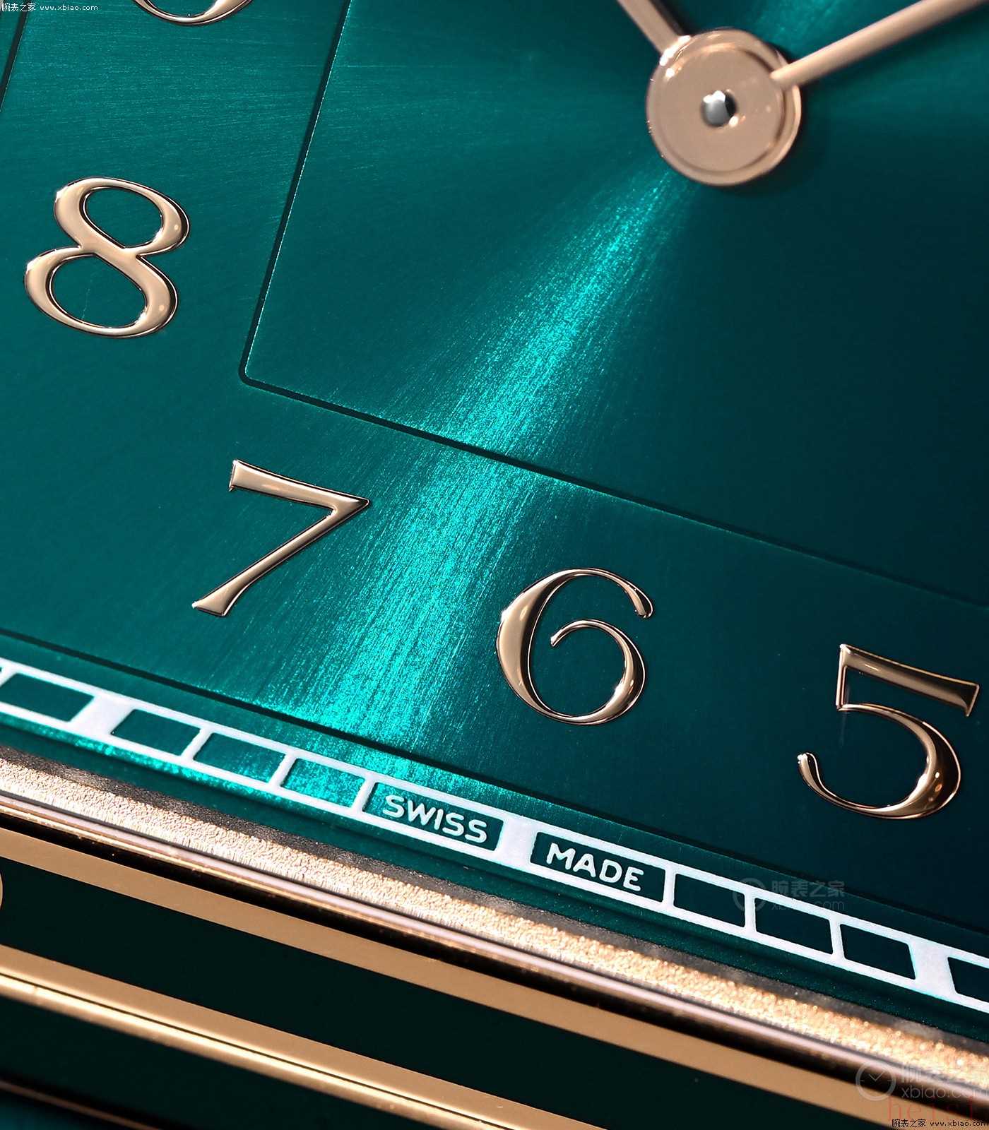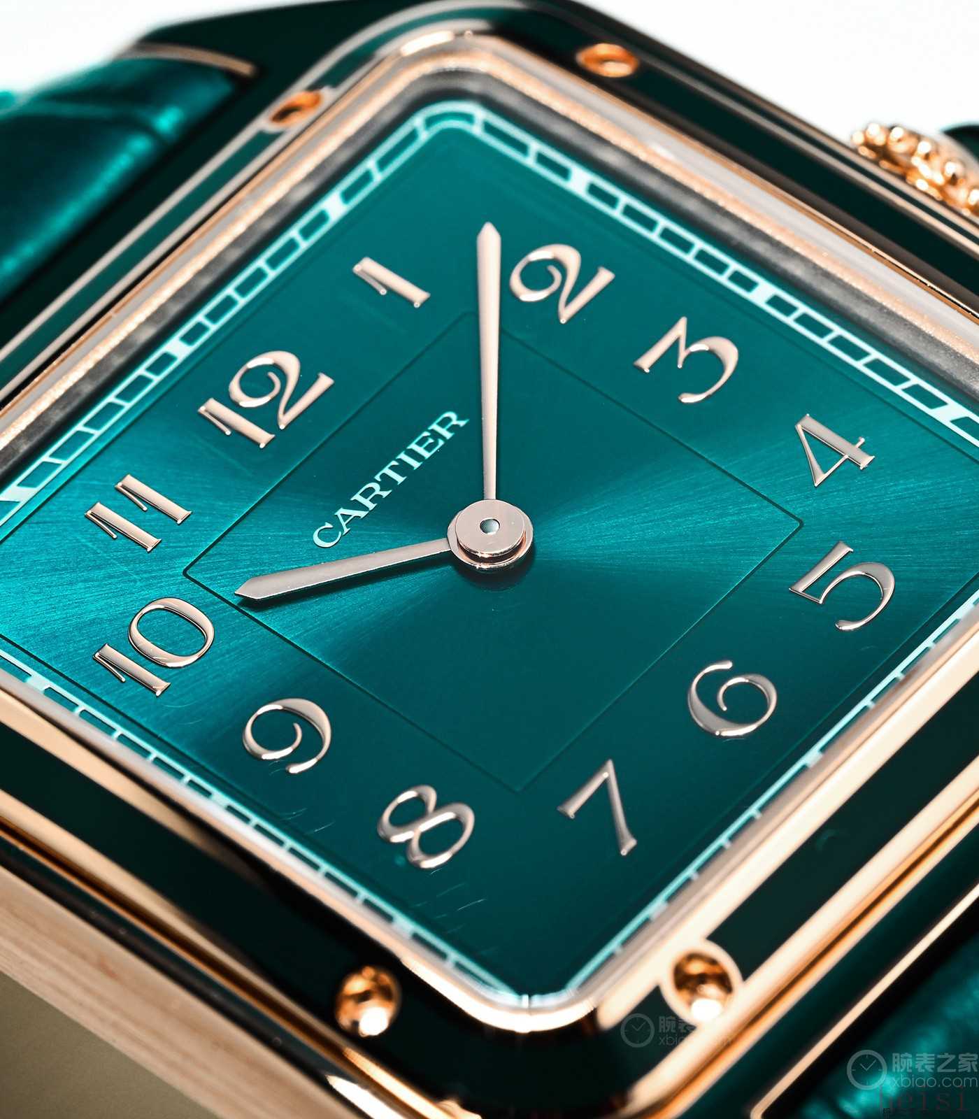 “孔雀藍(lán)”的顏色,是介于蒂芙尼藍(lán)、綠色之間,這也踏在了時下最流行的名表配色上。和其他山度士·杜蒙不同的是,這只“孔雀藍(lán)”的盤面使用了數(shù)字時標(biāo),和絕大部分山度士·杜蒙的“裝飾藝術(shù)風(fēng)格”羅馬字放射時標(biāo),形成區(qū)別。目前也只有“彩色漆面鍍層”款山度士·杜蒙,使用數(shù)字時標(biāo),體現(xiàn)了它的特殊且尊貴的地位。