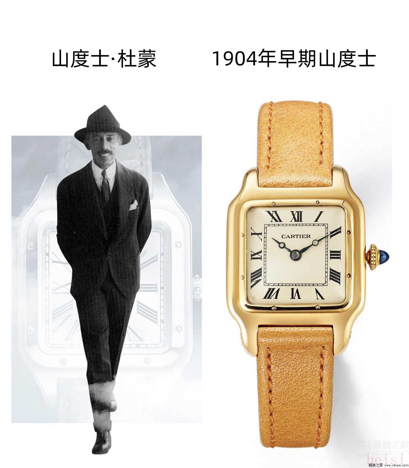 山度士·杜蒙本人,以及1904年早期的卡地亞山度士手表。