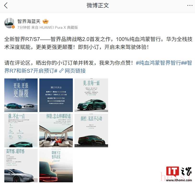 IT之家注意到,智界產(chǎn)品總監(jiān) @智界海藍天 今日發(fā)文宣布,全新智界 R7 / S7 是智界品牌戰(zhàn)略 2.0 首發(fā)之作、100% 純血鴻蒙智行,由華為全棧技術深度賦能。
