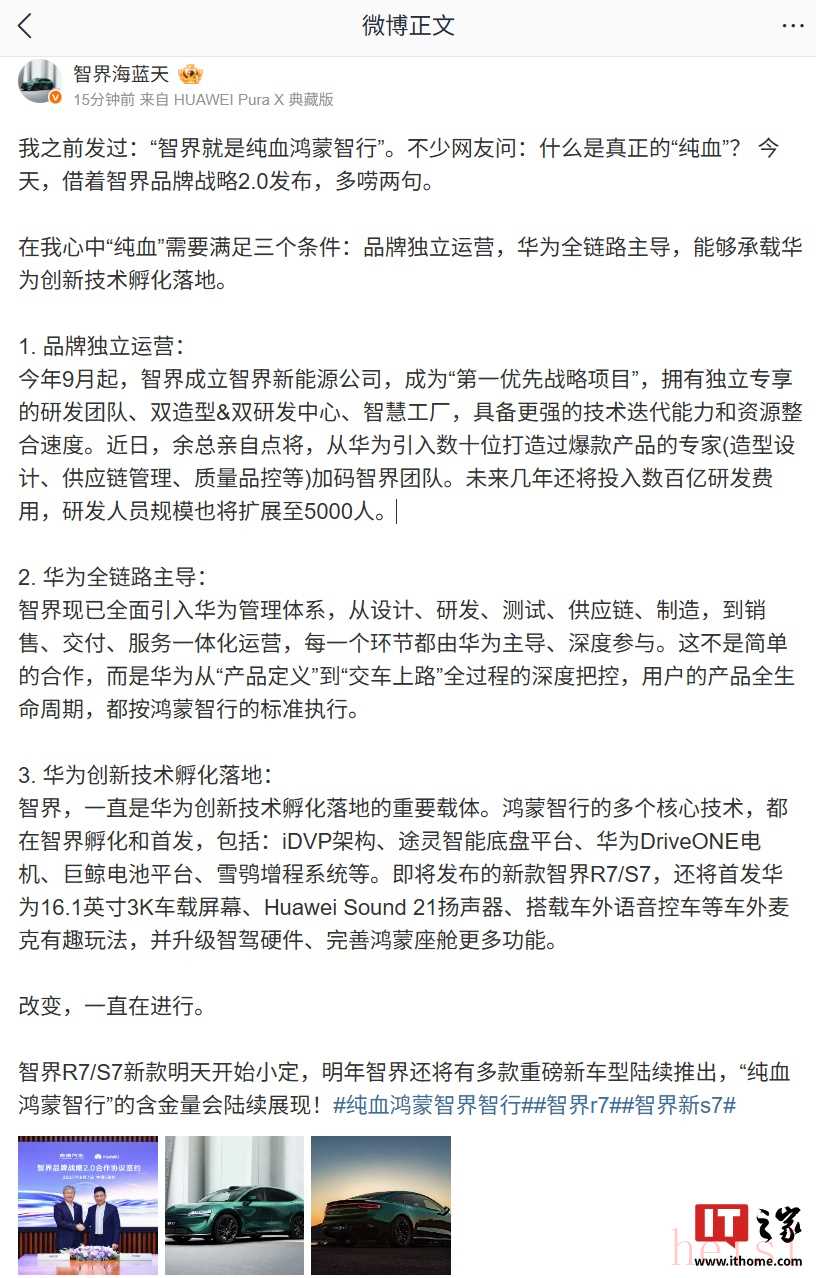 智界產(chǎn)品總監(jiān) @智界海藍天 還透露,余總(IT之家注:華為常務董事、終端 BG 董事長余承東)近日親自點將,從華為引入數(shù)十位打造過爆款產(chǎn)品的專家 (造型設計、供應鏈管理、質(zhì)量品控等) 加碼智界團隊。智界還已全面引入華為管理體系,從設計、研發(fā)、測試、供應鏈、制造,到銷售、交付、服務一體化運營,每一個環(huán)節(jié)都由華為主導、深度參與。