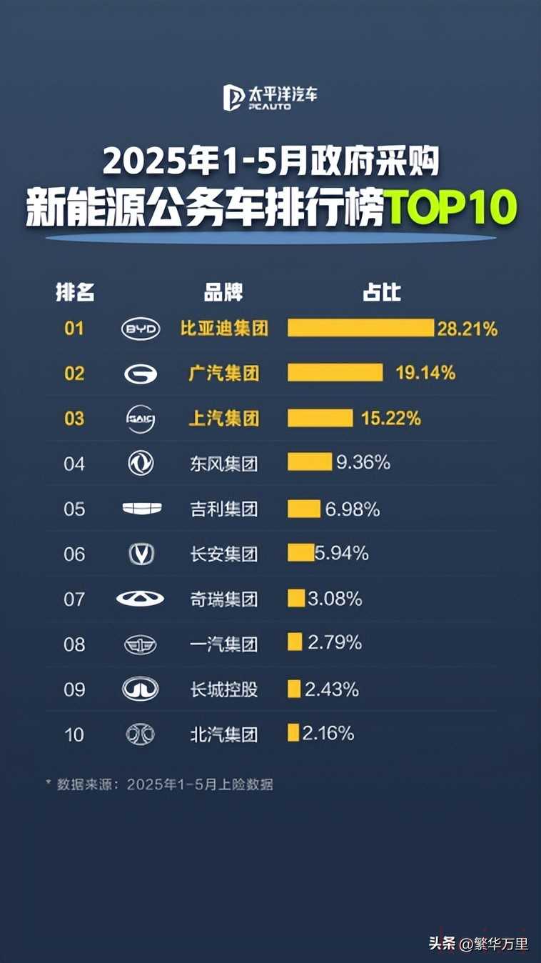 最近兩天,我國采購新能源公務(wù)車榜單發(fā)布。不得不說,比亞迪的表現(xiàn),非常亮眼。2023年、2024年,比亞迪已經(jīng)連續(xù)2年,成為政府采購新能源公務(wù)車的冠軍。今年前5個(gè)月,比亞迪仍舊保持大幅領(lǐng)先,比亞迪成為公務(wù)車首選。