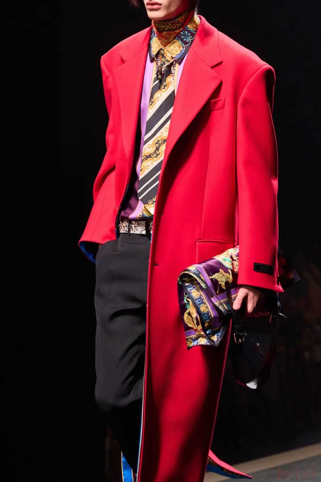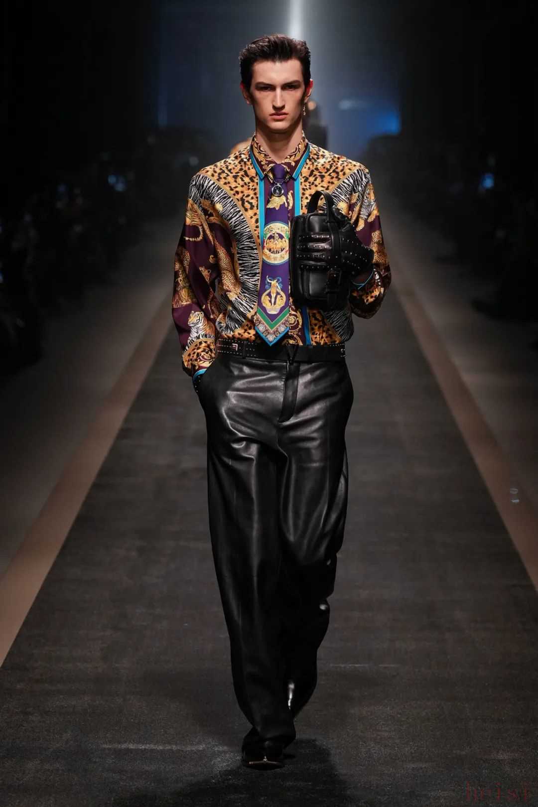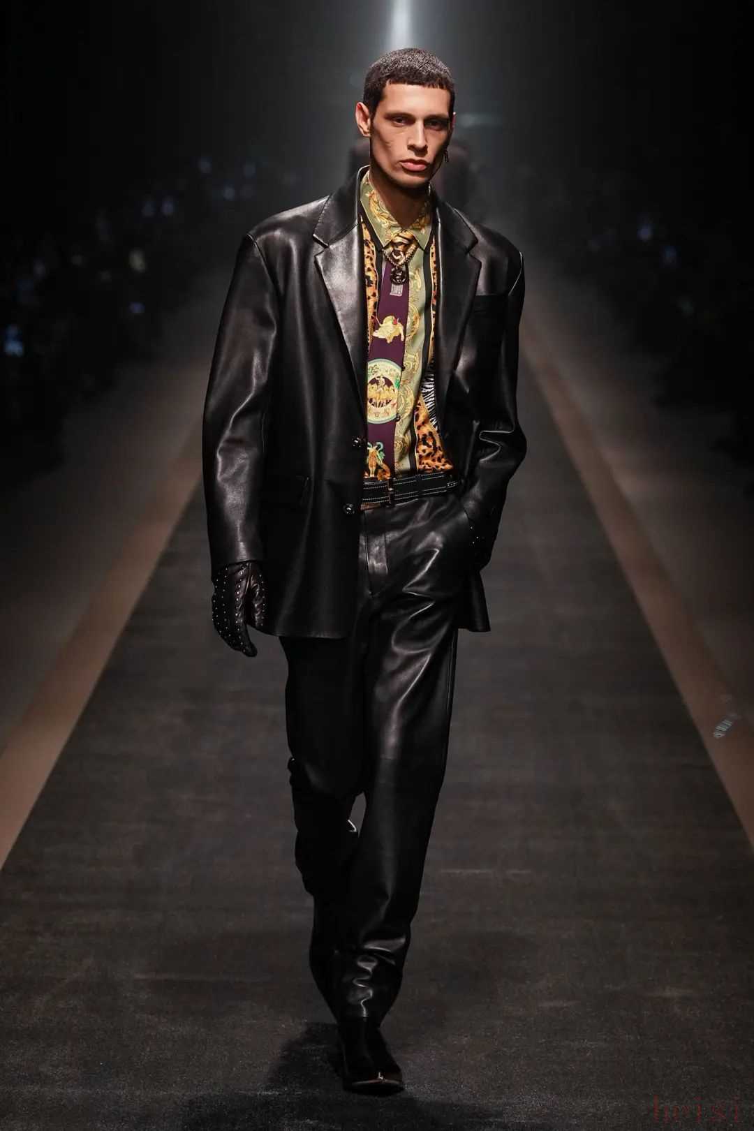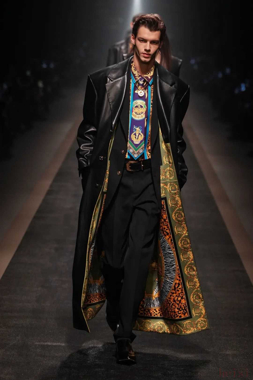 外界盛行的靜奢與簡約不是Donatella奉行的信條,熱情、強勢、棱角分明的力量感才是她的拿手好戲。男裝造型在硬朗的皮革大衣、皮質套裝中融入了層疊搭配的巴洛克印花單品,是經典的Versace風格圖騰。