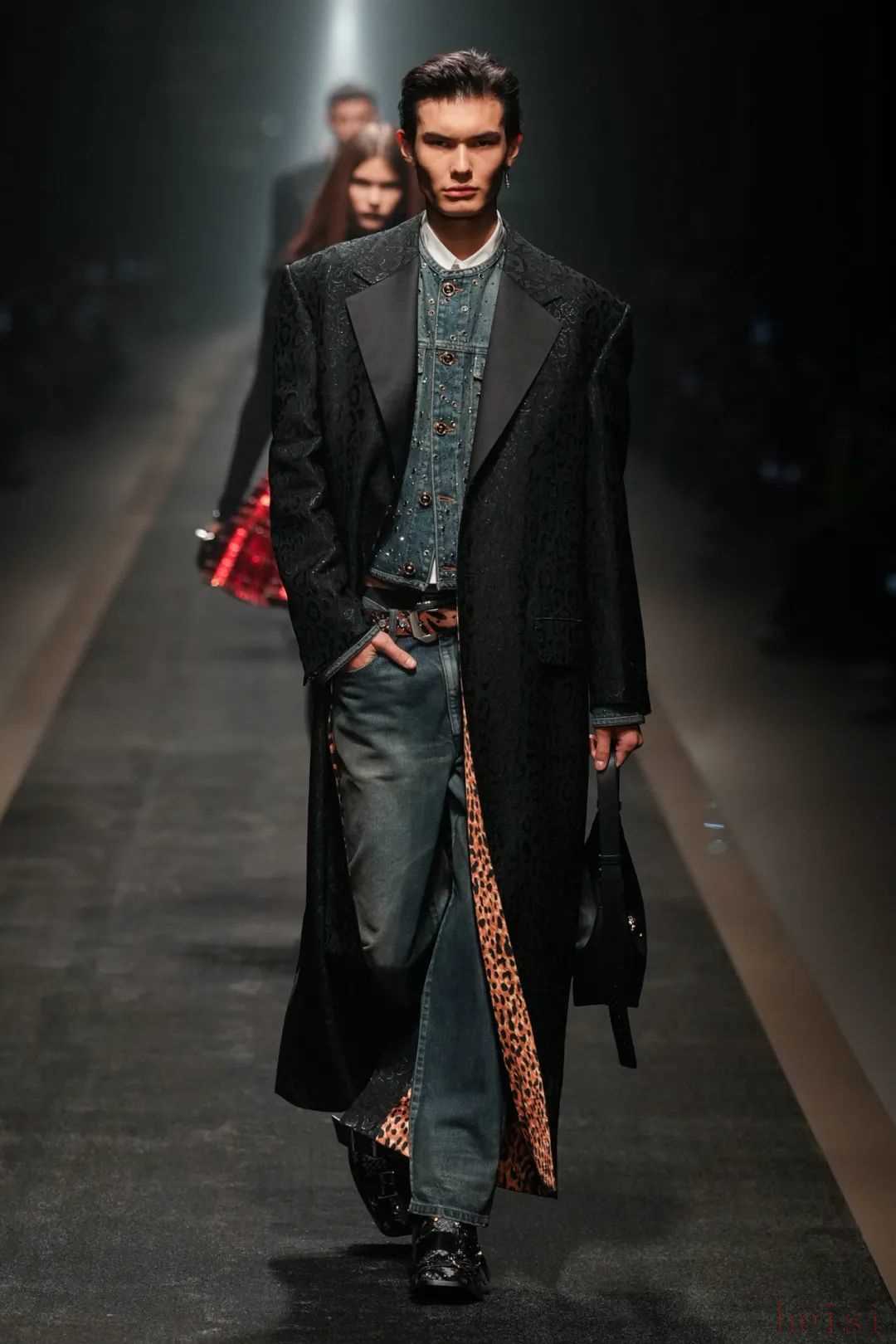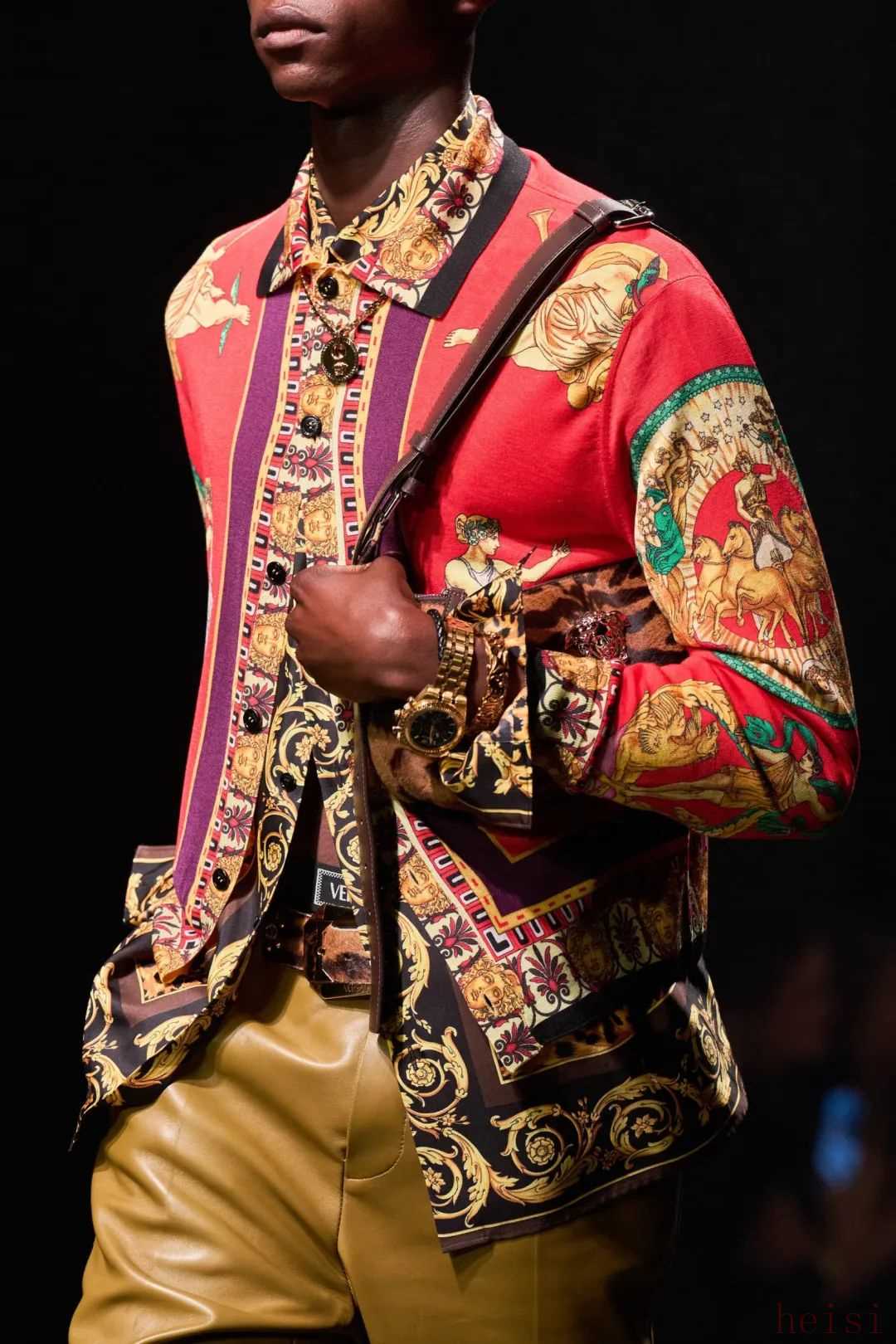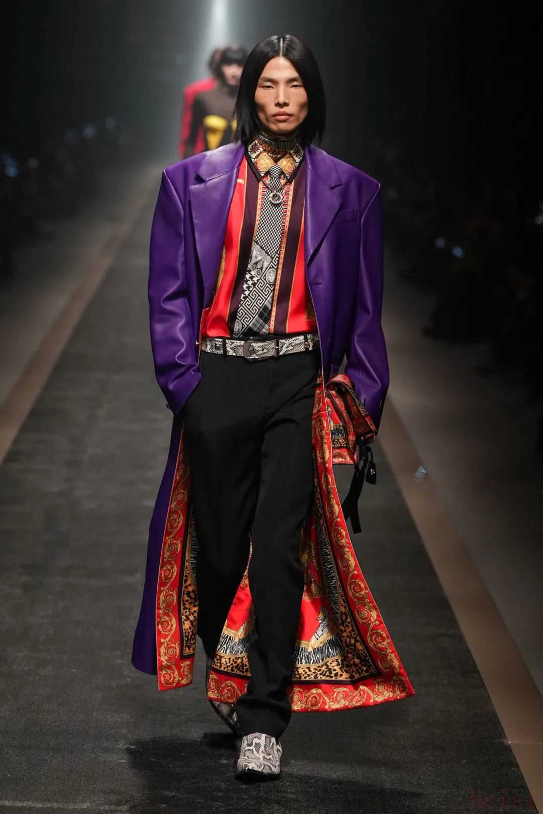外界盛行的靜奢與簡約不是Donatella奉行的信條,熱情、強勢、棱角分明的力量感才是她的拿手好戲。男裝造型在硬朗的皮革大衣、皮質套裝中融入了層疊搭配的巴洛克印花單品,是經典的Versace風格圖騰。