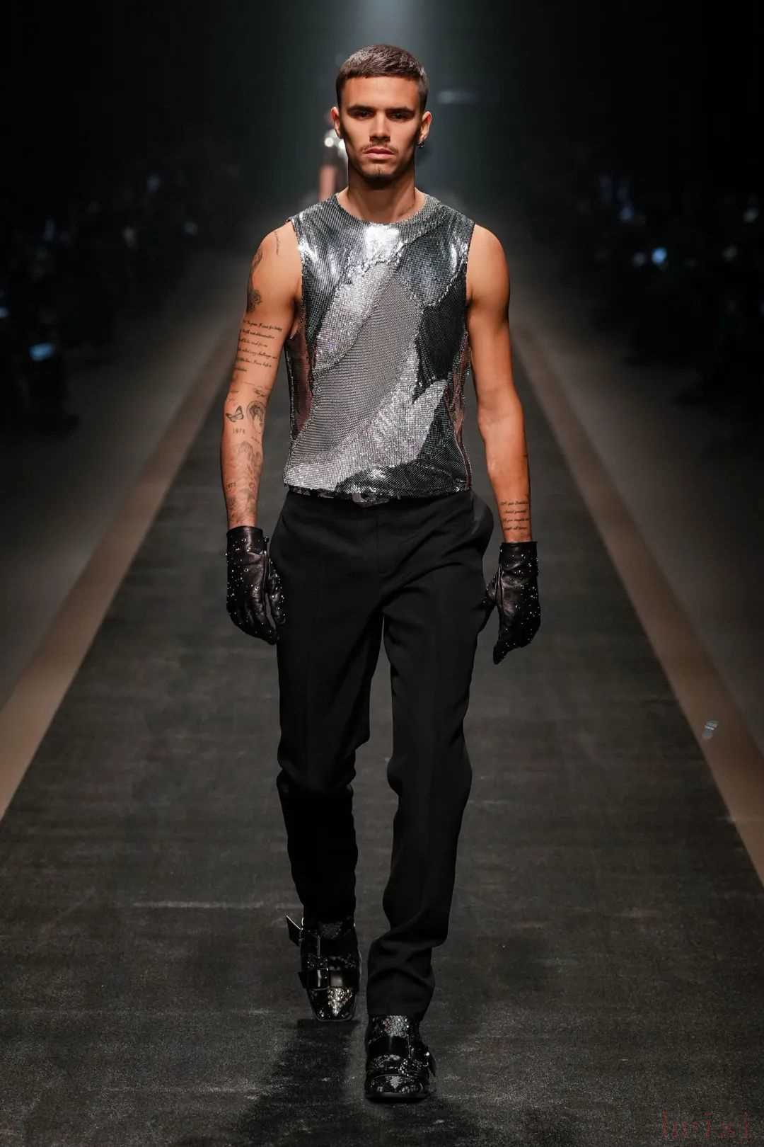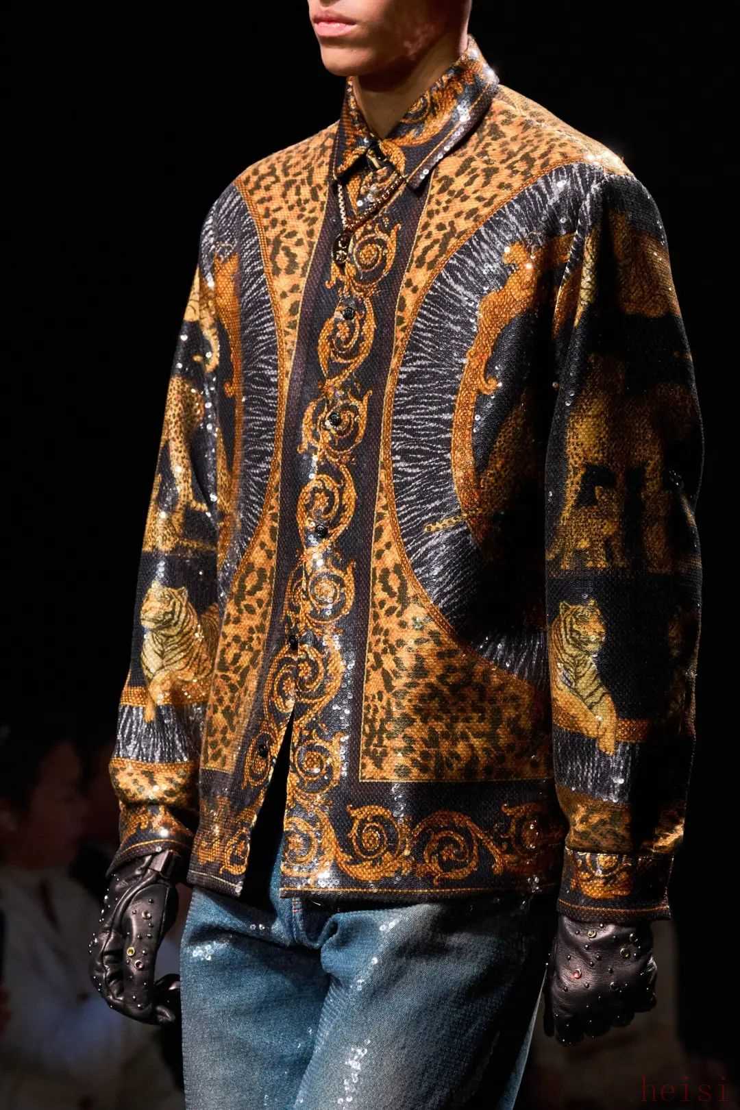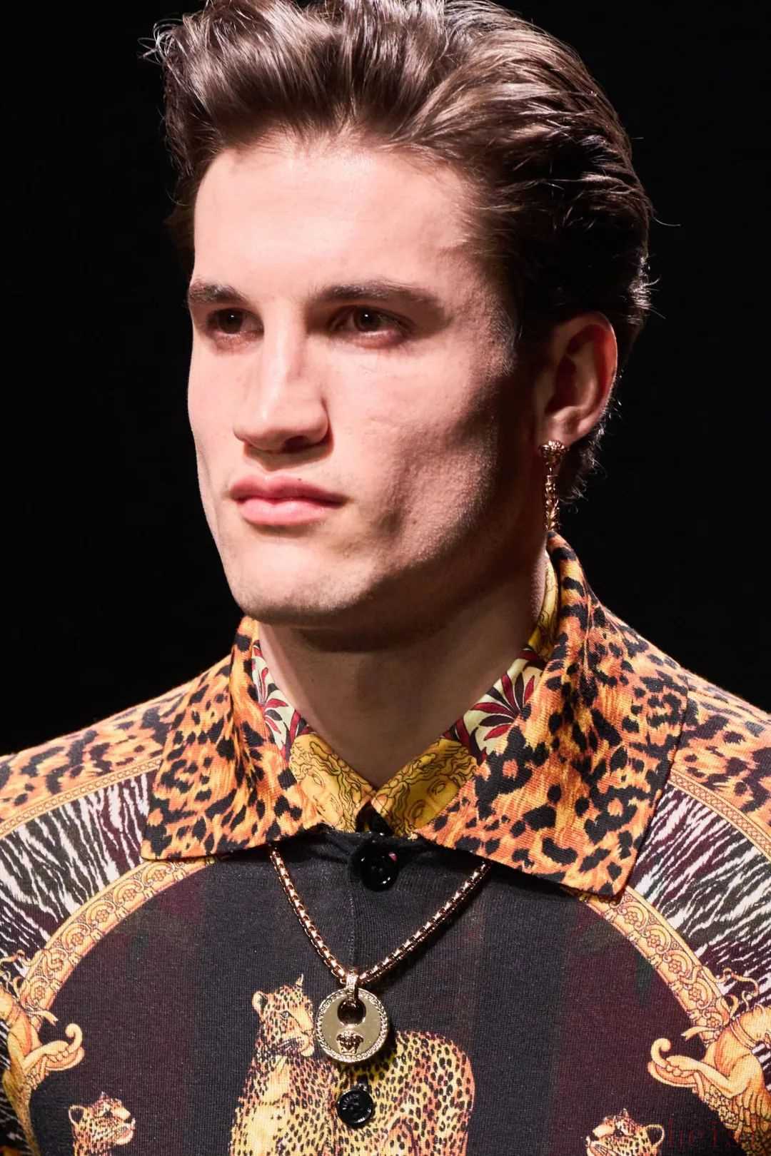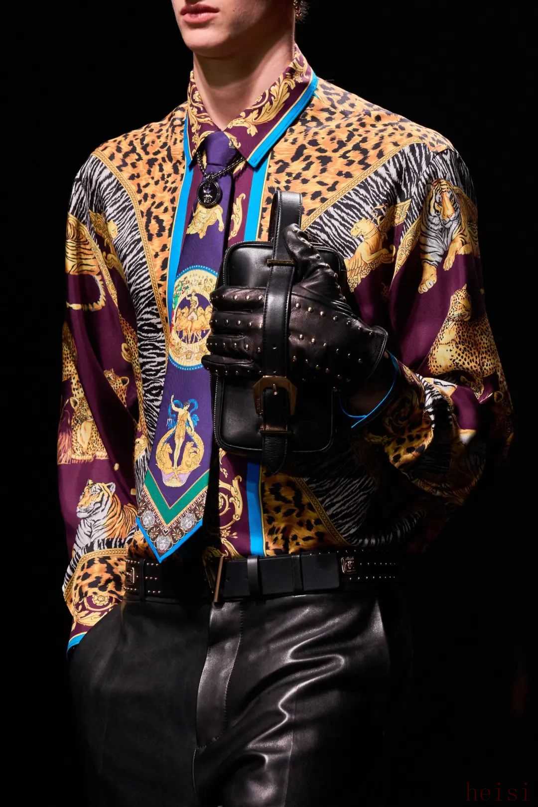 外界盛行的靜奢與簡約不是Donatella奉行的信條,熱情、強勢、棱角分明的力量感才是她的拿手好戲。男裝造型在硬朗的皮革大衣、皮質套裝中融入了層疊搭配的巴洛克印花單品,是經典的Versace風格圖騰。