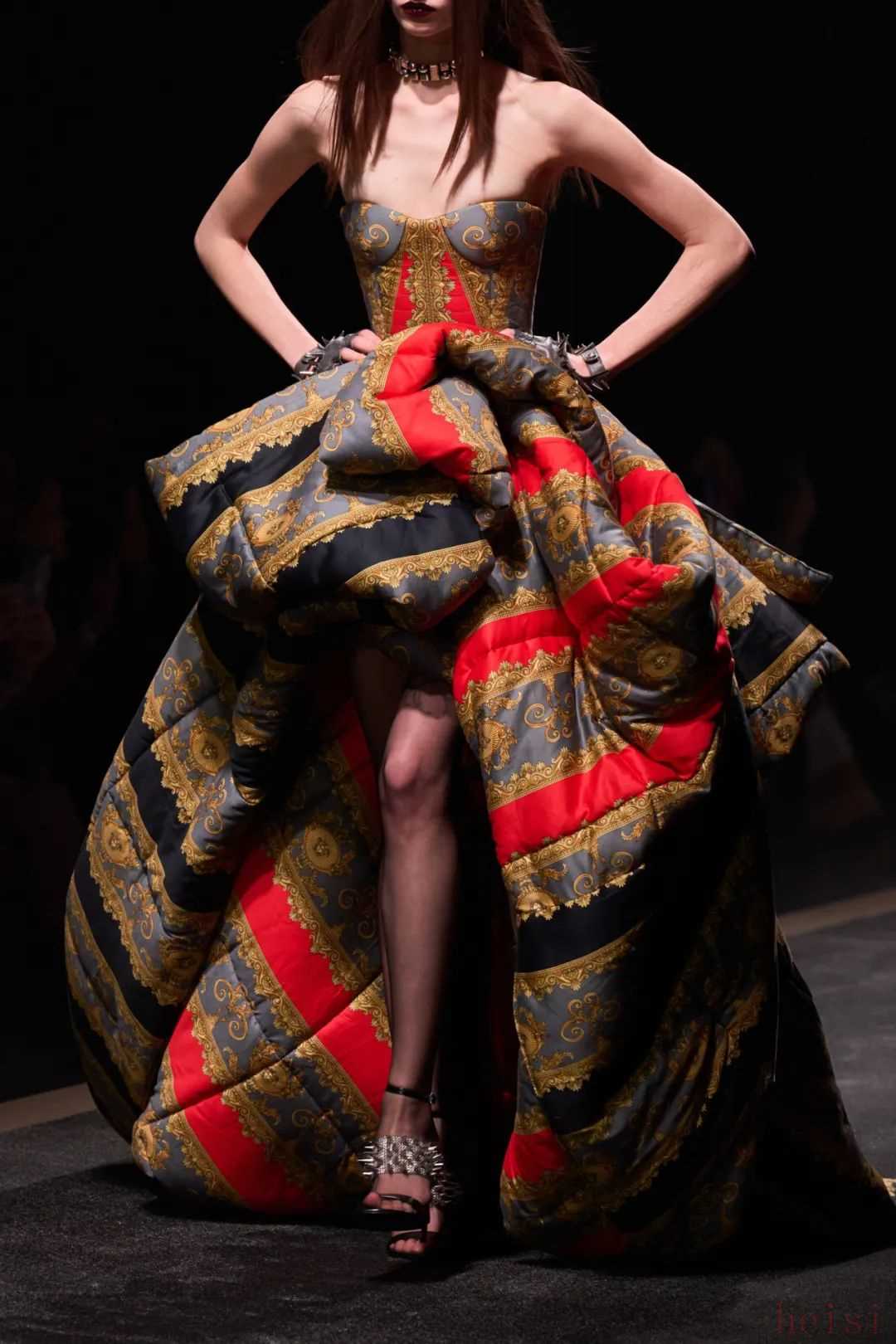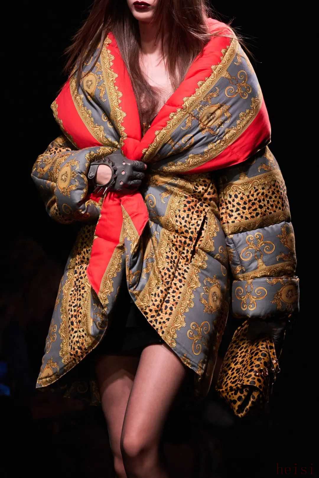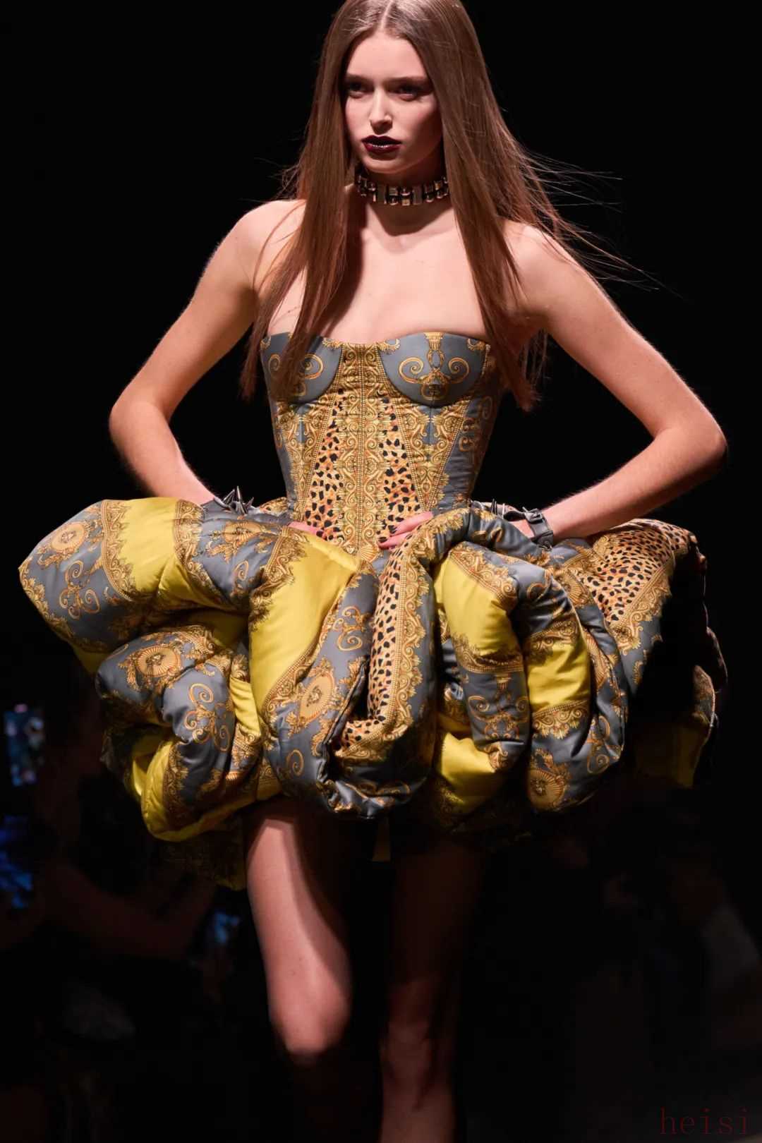 與秀場預告遙相呼應的是秀場開場的三款造型,以Versace Home家居系列羽絨單品設計而成的外套和禮服,以創(chuàng)意堆疊與剪裁構筑成了意想不到的服裝輪廓?!霸谶@個系列中,我不拘泥于任何規(guī)則,只遵循深植于Versace基因中的準則。” Donatella以此為整個系列奠定了美學規(guī)范。