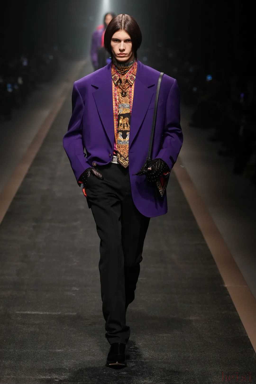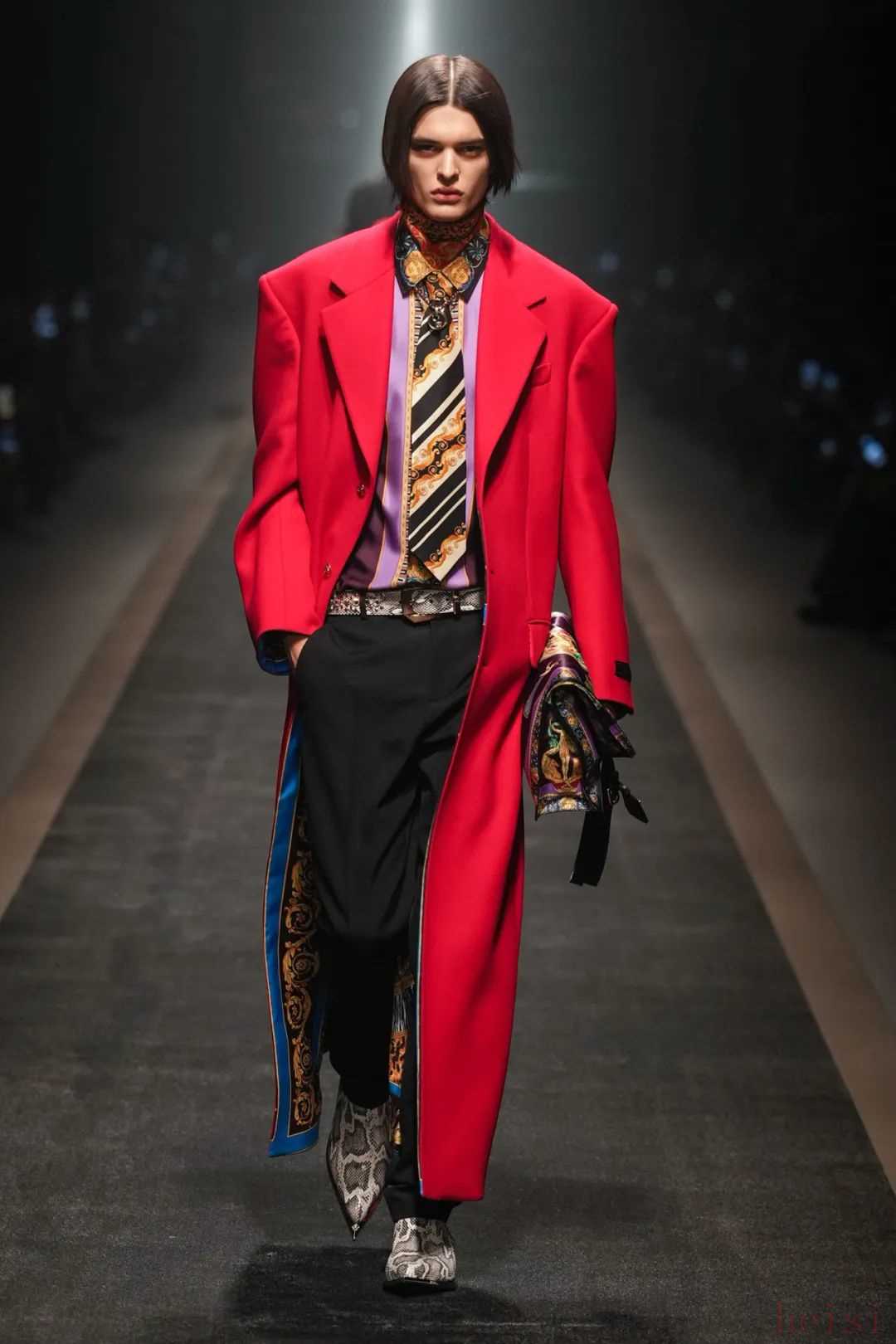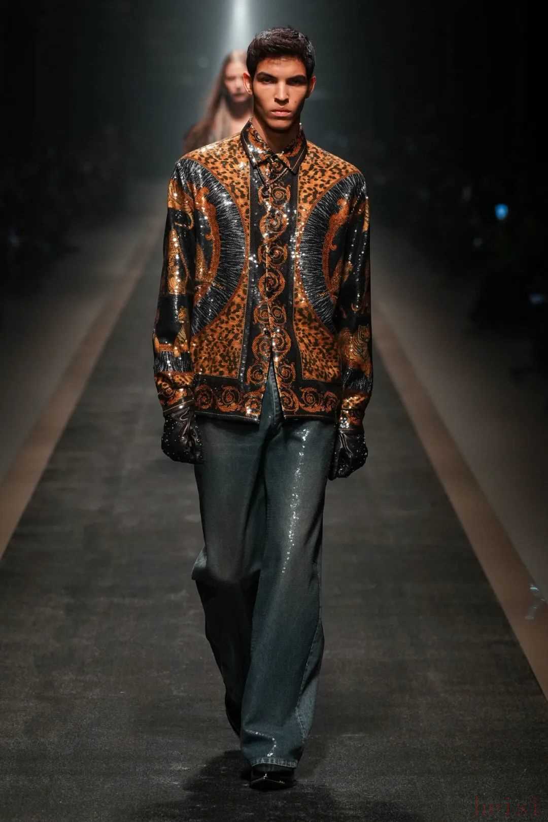 Versace男士顯然無懼駕馭色彩,鎏金、赤緋、群青、水仙黃與黑色基調形成強烈對比,為本季渲染上了本真色彩,亮眼色系與大面積巴洛克圖案無畏碰撞,重構了跳脫常規(guī)的奢華敘事。