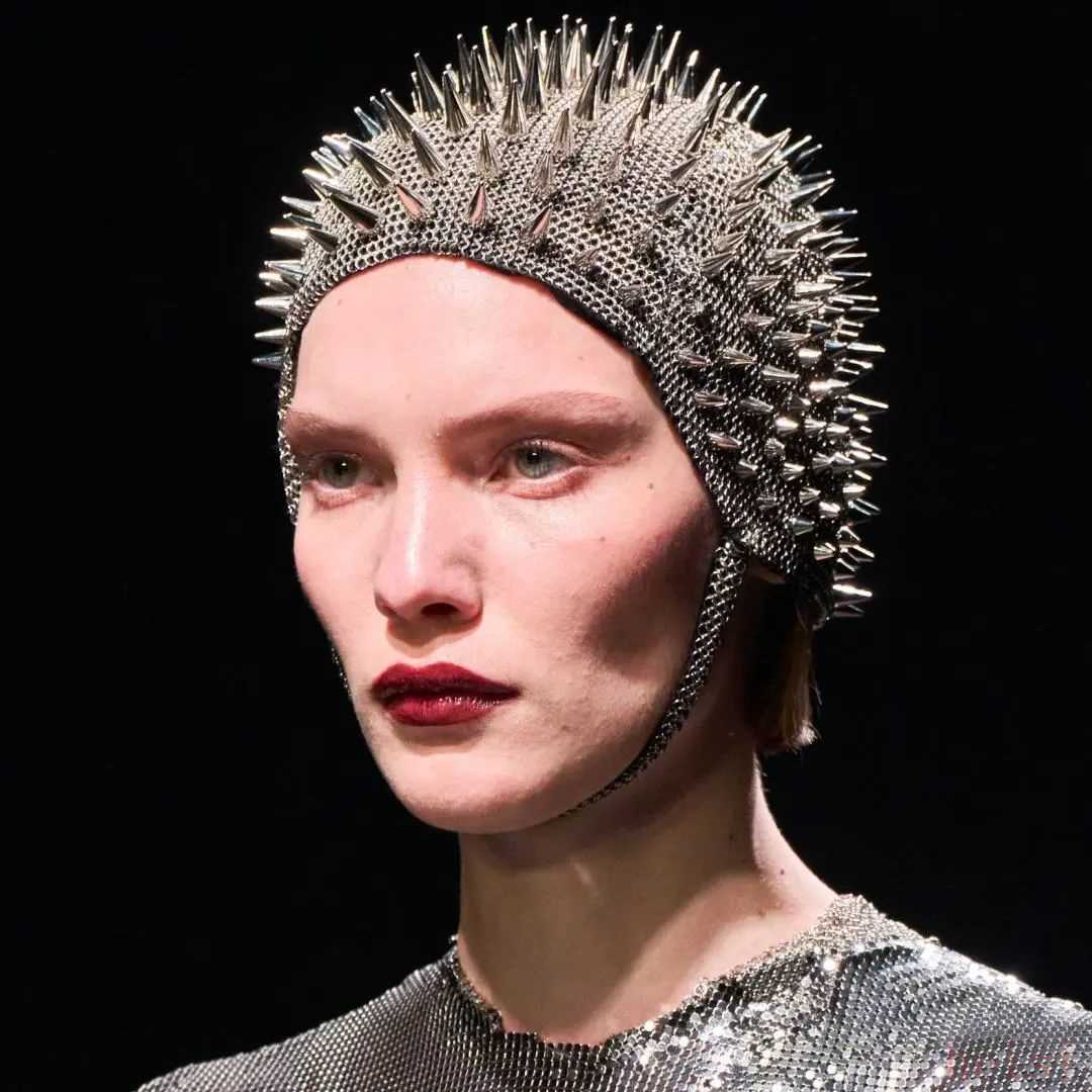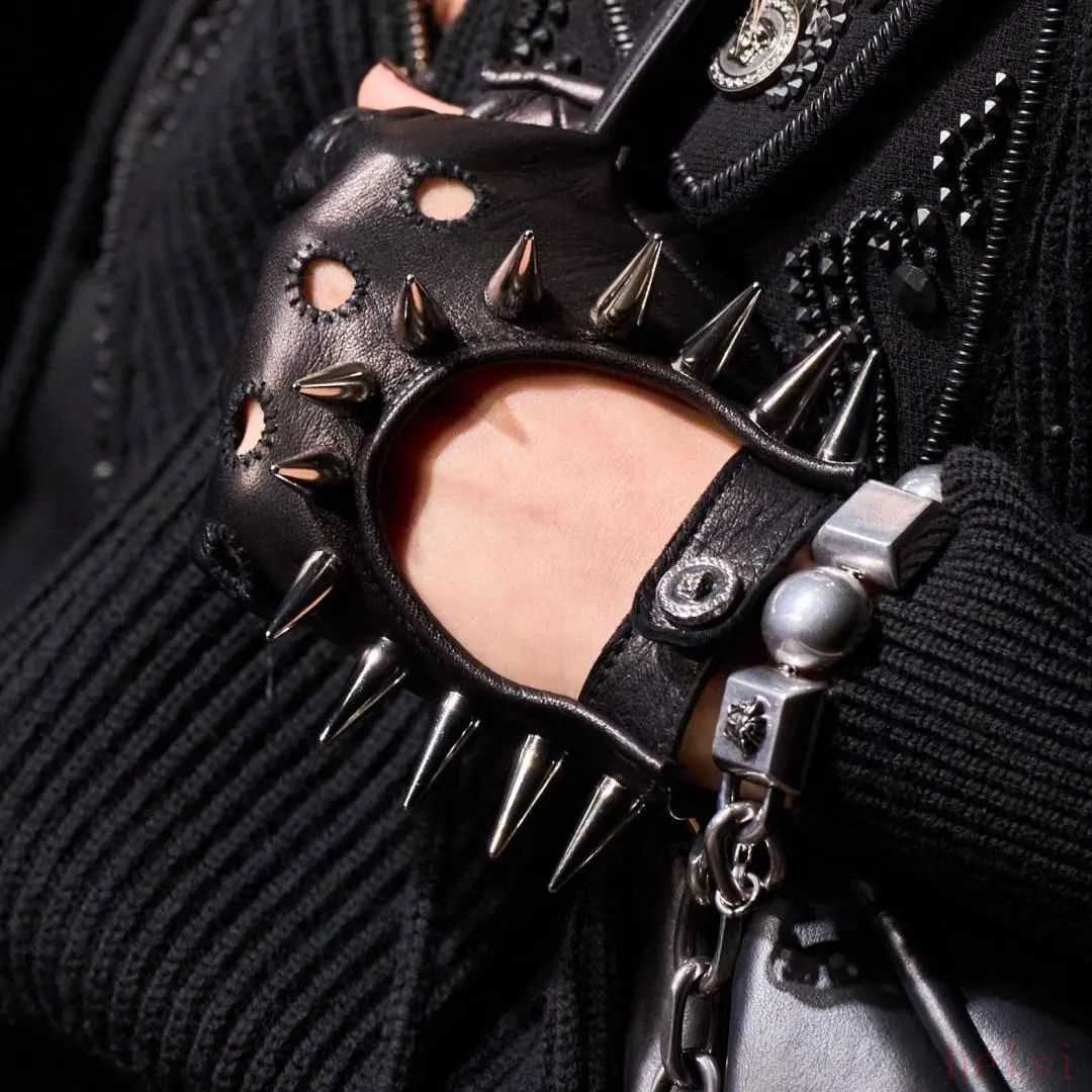 忠于自我不僅在于堅持延續(xù),也在于放眼未來。本季創(chuàng)作在品牌慣往的新古典主義當中融入了未來因素,熱烈的意式風情里滲入了硬核的搖滾樂基因,鉚釘頭飾、皮革手套、尖刺裝飾的皮帶與皮靴帶來了前衛(wèi)的先鋒感。
