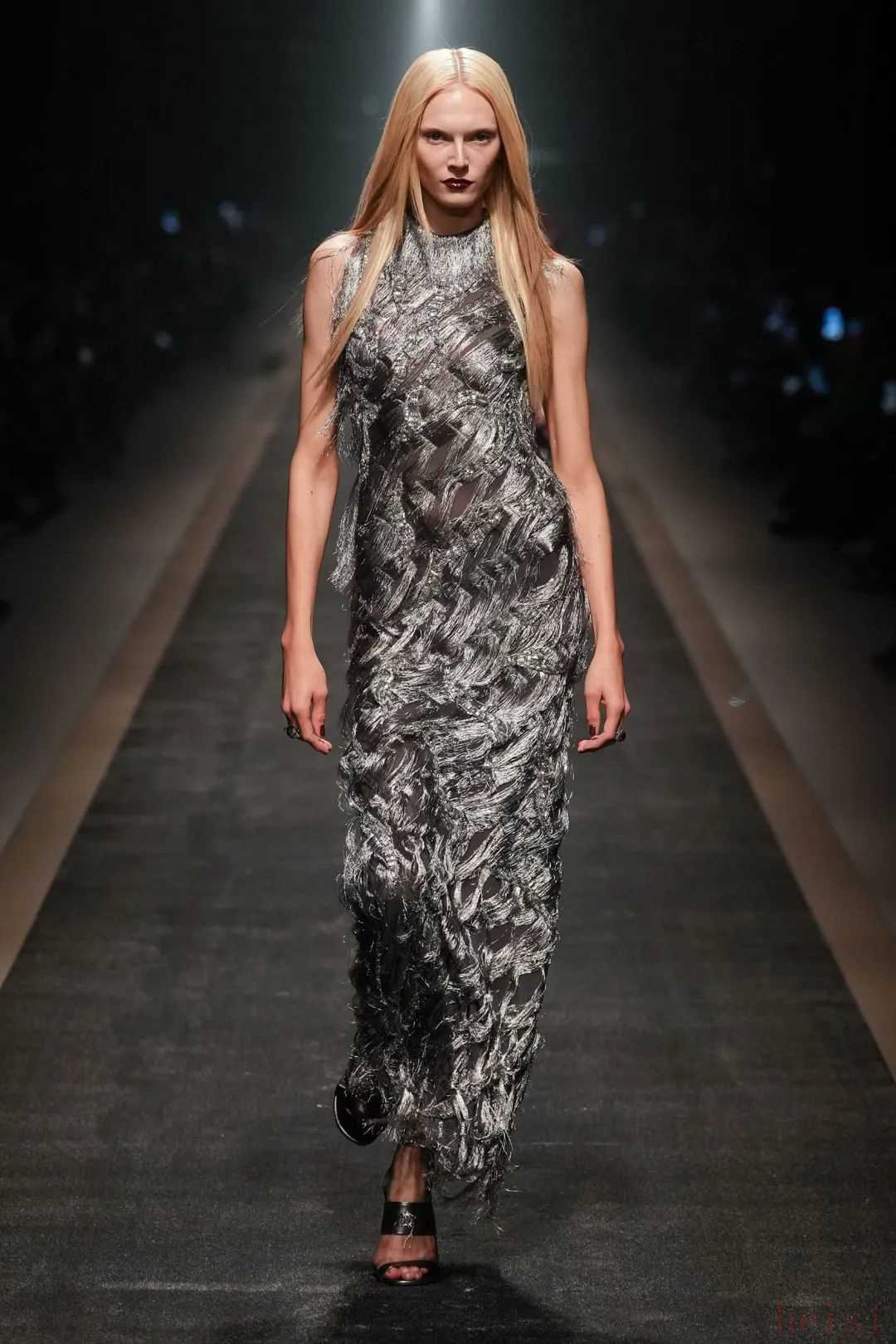 經典元素在匠心工藝中被結構重生,禮服與結構針織衫以升級再造的鏈甲、金屬網與水晶網的拼接工藝打造;兩款連衣裙復刻自Atelier Versace 1998秋冬高級定制系列的經典之作,以交織的金銀線織就,綴以珠飾、水晶和管珠裝飾,盡顯搖滾與奢華的交融魅力。