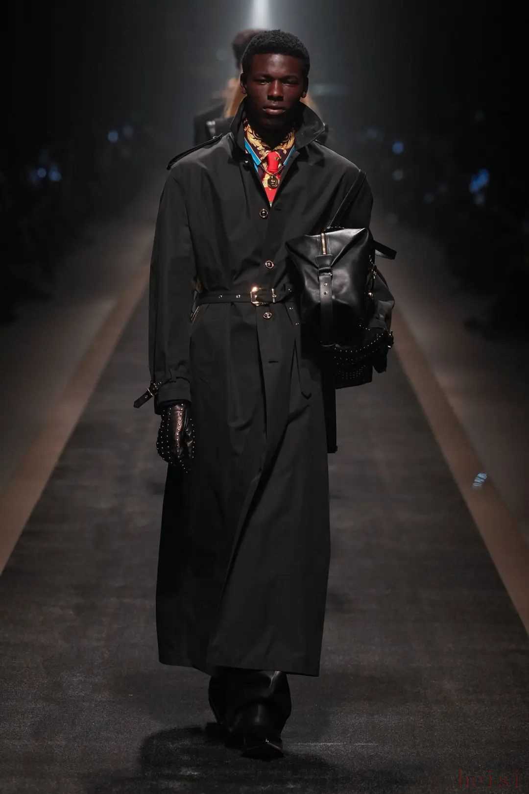 衣領、腰線、剪裁棱角分明,V型輪廓和強勢的權力墊肩呈現(xiàn)了創(chuàng)始人Gianni Versace所處的80年代風格,風衣采用雕塑感十足的廓形設計,寬大挺括,這也濃縮成為本季大部分造型的風格特點。