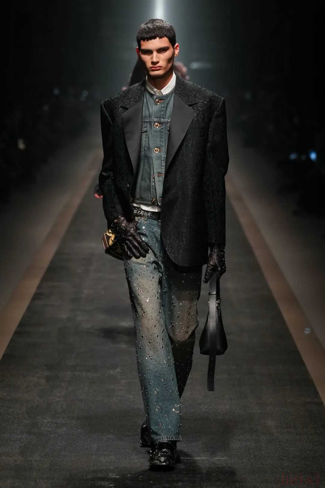 談及本季男裝靈感,Donatella曾說她會觀察生活中年輕人的混搭穿衣方式,從街頭汲取創(chuàng)作思路。經由水洗工序呈現(xiàn)復古質感的日式牛仔,覆以閃耀水晶刺繡或個性鉚釘,想必正是來源于此。