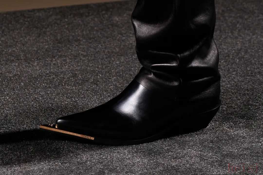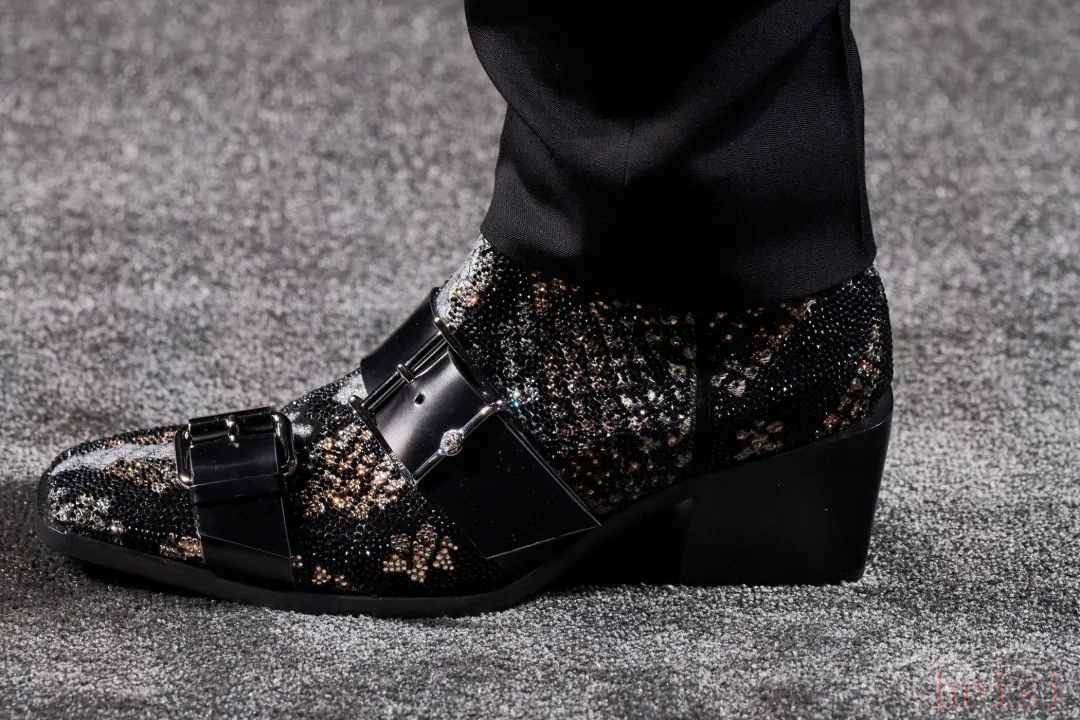 男裝系列的手拿包、托特包和Hobo手袋采用褶皺印花絲巾材質,Santiago皮靴以切割水晶的V型金屬鞋頭銳化造型,Luciano短靴則飾以搭扣點綴。
