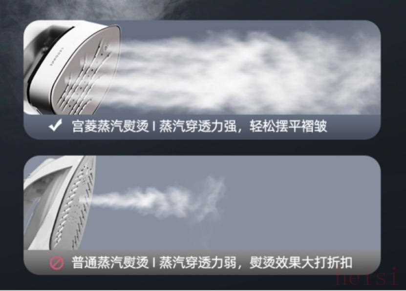 (2)功能實(shí)用∶納米陶瓷面板順滑,棉麻襯衣褶皺兩次即平,衣領(lǐng)挺立。推動(dòng)式操作鍵防誤觸,比點(diǎn)按/觸控款更省心。