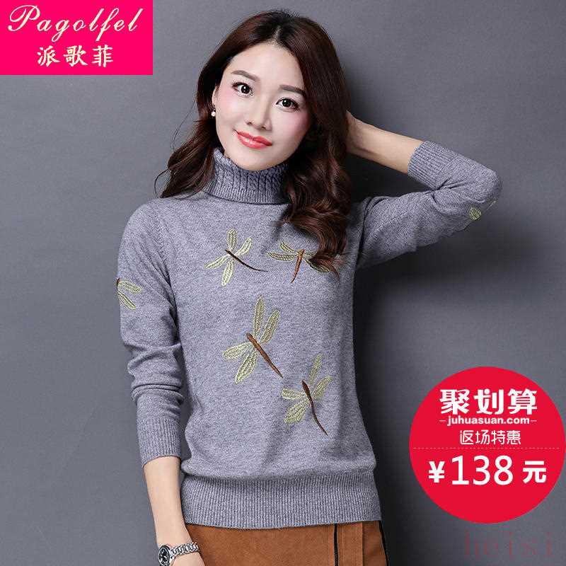 高領(lǐng)毛衣女2015冬裝厚款針織衫蜻蜓繡花修身長(zhǎng)袖百搭套頭打底衫