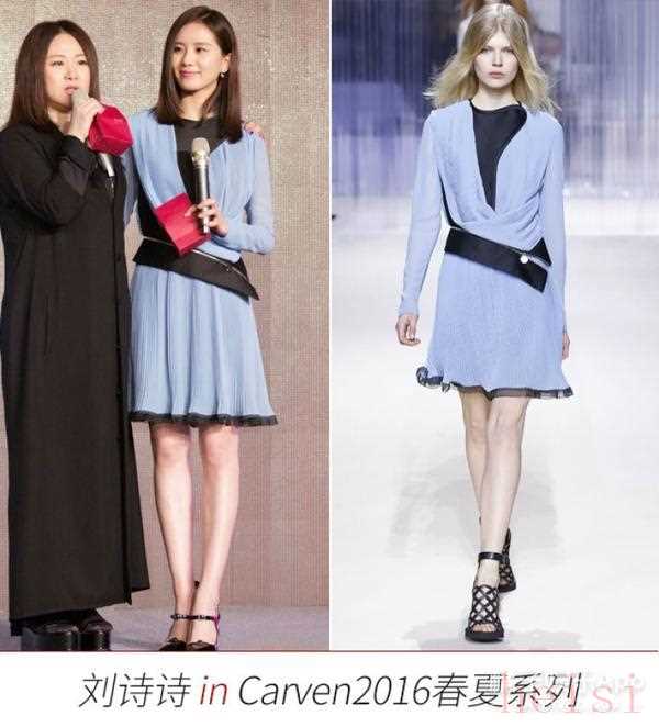 即便是出席年會(huì),詩(shī)詩(shī)也不忘穿著Carven亮相。一襲淺藍(lán)色長(zhǎng)裙,給人撲面而來(lái)的清爽,不規(guī)則黑色腰帶飾在腰間,勾勒B5腰的手法也是沒sei了~女神好美!