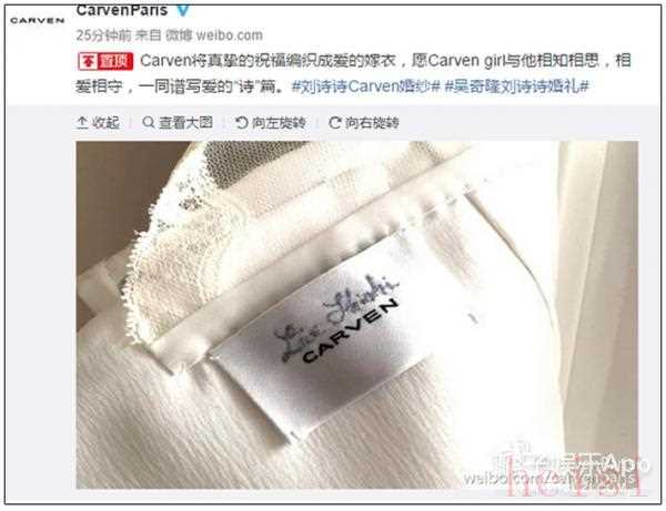 "Carven獨(dú)家定制給劉詩(shī)詩(shī)":這更是提升了這件嫁衣的珍貴度和獨(dú)特性。Carven的設(shè)計(jì)風(fēng)格通常時(shí)尚、現(xiàn)代且?guī)в蟹ㄊ絻?yōu)雅,與劉詩(shī)詩(shī)的氣質(zhì)相得益彰。