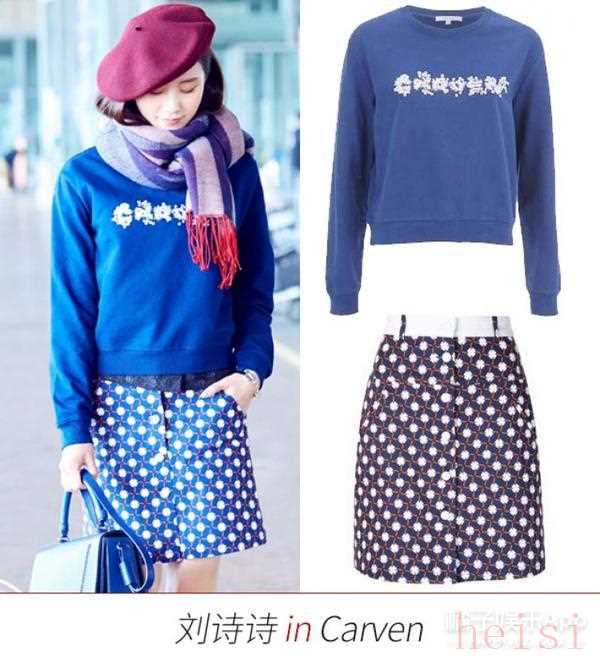 在遠(yuǎn)赴巴黎之前,在機(jī)場(chǎng)穿著Carven藍(lán)色衛(wèi)衣搭配藍(lán)色波點(diǎn)短裙以及同色挎包,早就美Cry~而頭頂?shù)木萍t色畫家帽又在美麗上面加上一種減齡的可愛,活潑與優(yōu)雅火候拿捏剛好。