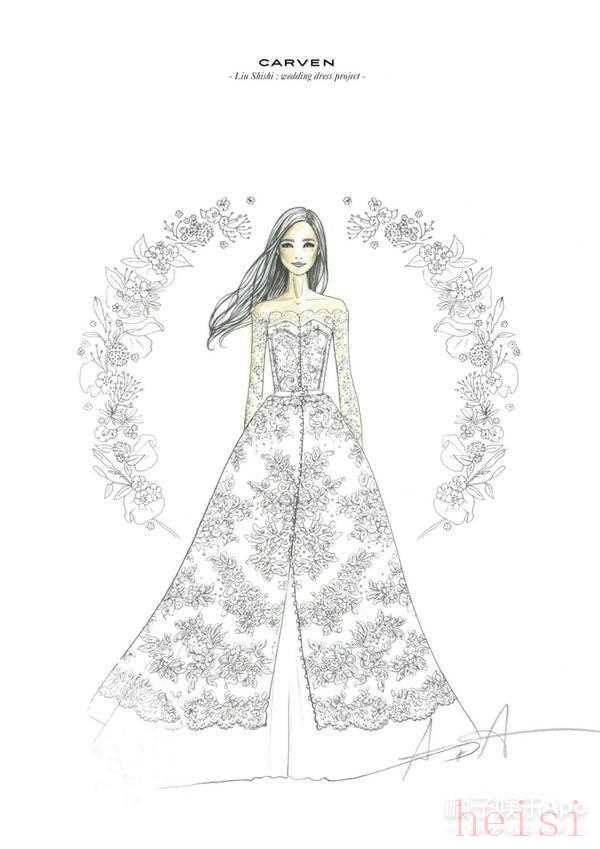 在品牌曝光細(xì)節(jié)圖之后,婚紗的手繪圖也公布了!從圖片上看,這件婚紗是一字肩設(shè)計(jì),全身布滿蕾絲,而里層由純白打底,胸前有小抹胸設(shè)計(jì),貫穿婚紗的單排扣子散發(fā)著宮廷貴族氣息。