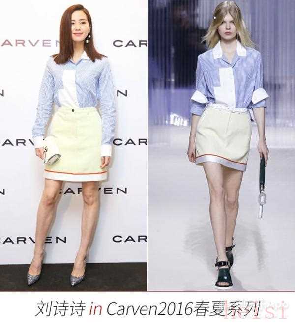在香港置地廣場(chǎng)參加Carven品牌新店開幕,身穿Carven 2016春夏女裝,淺藍(lán)色條紋對(duì)撞白色幾何塊的襯衣大膽又清爽,淡黃色A字裙加之一抹亮紅突顯詩(shī)詩(shī)的嬌俏。