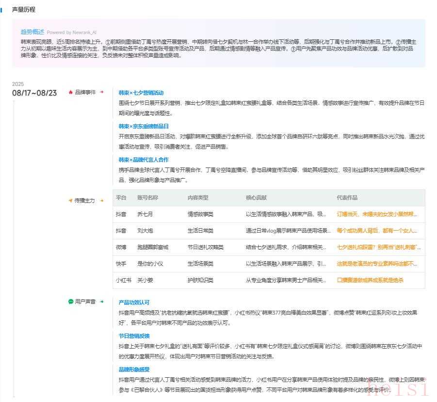 2. 節(jié)日營銷反饋 抖音上關(guān)于韓束七夕禮盒的“送禮有面”等評價較多,小紅書有“韓束七夕限定禮盒儀式感滿滿”的討論,微博則圍繞韓束在京東七夕活動中的優(yōu)惠力度展開熱議,體現(xiàn)出用戶對韓束節(jié)日營銷活動的關(guān)注與反饋。