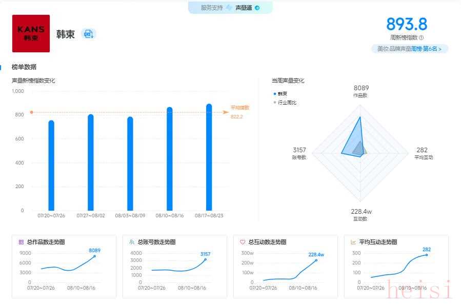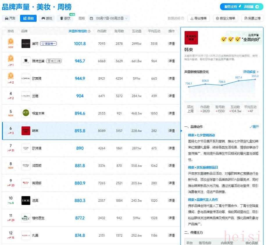 新榜品牌聲量?美妝周榜(08 月 17 - 08 月 23 日)出爐,韓束以 893.8 的聲量新榜指數(shù)位列第六 ,且環(huán)比上周,作品數(shù)增加 2820,賬號數(shù)增加 1350,互動量提升 104.3w ,聲量持續(xù)上漲,勢頭強勁。在競爭激烈的美妝市場,韓束靠這些動作成功圈粉。