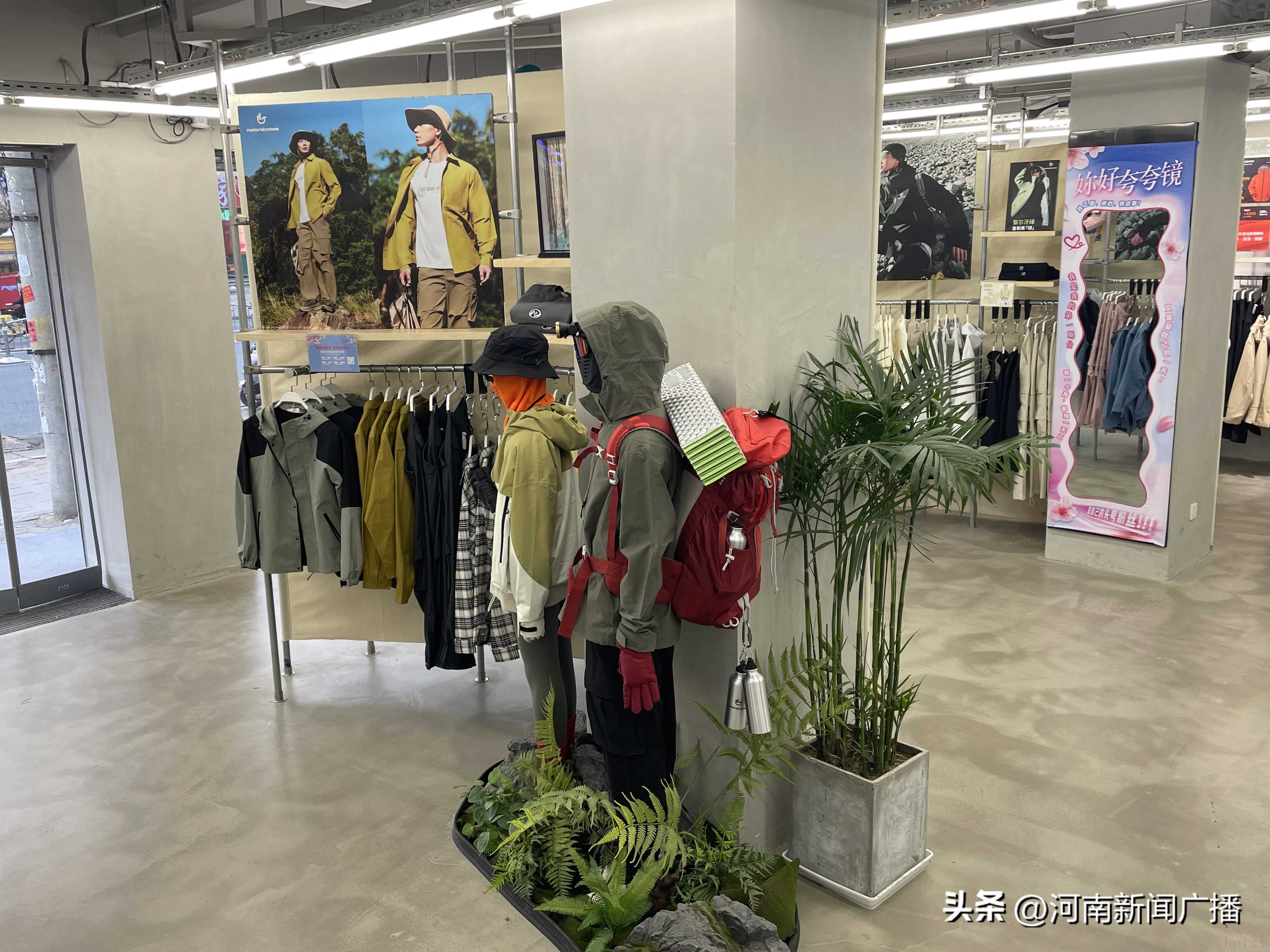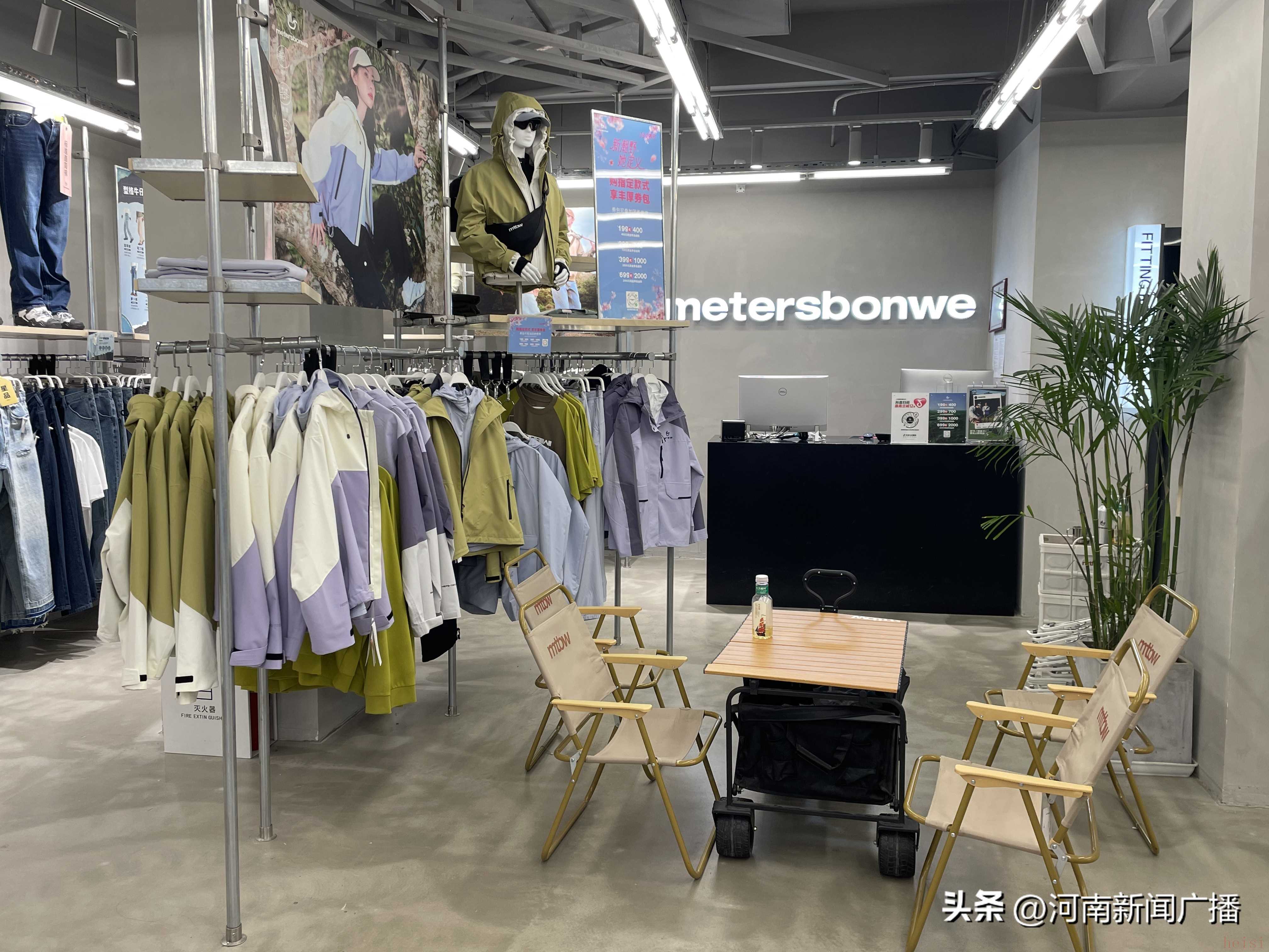 在鄭州美特斯邦威線下門店,記者看到,盡管還保留有傳統(tǒng)的衛(wèi)衣、牛仔褲等休閑服飾,但沖鋒衣、速干褲等戶外單品占據(jù)了三分之二的貨架,店內(nèi)還加入了露營(yíng)椅、蛋卷桌、小推車等戶外元素突出品牌新定位。