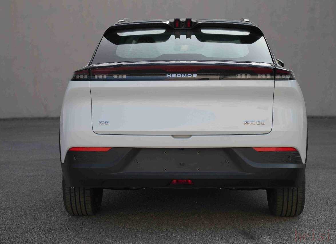 車身側(cè)面及尾部,示界首款SUV沿用東風(fēng)風(fēng)神SKY EV01的造型,具有隱藏式門把手、19英寸鋁合金輪輞、貫穿式尾燈、車頂后擾流板等設(shè)計(jì)元素。新車尾燈中部為全新英文車標(biāo)“HEDMOS”,據(jù)悉,為確保首款車型快速上市,神龍汽車先期在工信部以“東風(fēng)富康”品牌資質(zhì)申請(qǐng)公告,因此新車尾門右下角使用的是“富康06”車名標(biāo)識(shí)。