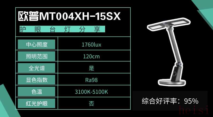 米家臺燈2延續(xù)了米家標(biāo)志性的極簡設(shè)計,純白機(jī)身搭配纖薄燈體,整體造型節(jié)省桌面空間,尤其適合小型書桌。60cm長燈頭的照射面積能覆蓋1.2m桌面,照度也升級至國AA級,比起米家1s光線表現(xiàn)更優(yōu)。燈頭前置了可視化滑條與實體鍵,支持小米APP智能互聯(lián),操作便捷。但燈頭僅能25°轉(zhuǎn)動,角度調(diào)節(jié)受限,影響多場景適配性。5、歐普推薦款:歐普MT004XH-15SX市場占比:87%上榜理由:雙翼光源面可隨場景靈活調(diào)光,適配多元照明需求。