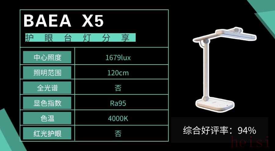 琪朗護(hù)瞳Pro護(hù)眼臺燈在外觀設(shè)計上很美觀,它采用了長達(dá)440mm獨(dú)特的月牙彎形燈頭,在美觀的同時也讓光源更好地覆蓋全學(xué)習(xí)桌面,可以照亮1.3米的長桌面。同時它采用的是亞克力材質(zhì),觸感細(xì)膩整體有質(zhì)感。在功能上值得一提的是,它不僅有40分鐘休息提醒和智能調(diào)光等功能,它還采用了升級版的人體動態(tài)感應(yīng)器,能夠更精準(zhǔn)地感應(yīng)落座入座并自動開關(guān)燈,更加智能化。8、BAEA推薦款:BAEAX5市場占比:80%上榜理由:表面進(jìn)行了4層噴涂陽化工藝加工,耐用性更有保障。