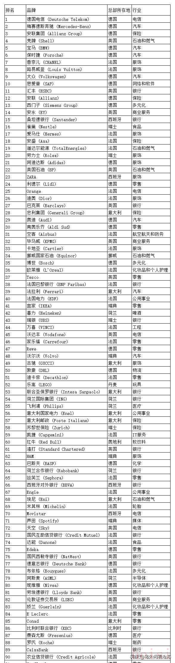 實(shí)際上,銀行、零售、保險(xiǎn)、電信等領(lǐng)域占據(jù)著許多榜單。在500個(gè)歐洲品牌中,有57家銀行、54家零售、40家服飾、33家保險(xiǎn)、33家電信、28個(gè)項(xiàng)目、26輛車、23家公共事業(yè)和21家單位。英國有93個(gè)品牌,85個(gè)法國,75個(gè)德國,40個(gè)和37個(gè)意大利和瑞士,德國、荷蘭、西班牙和荷蘭略微少一些。