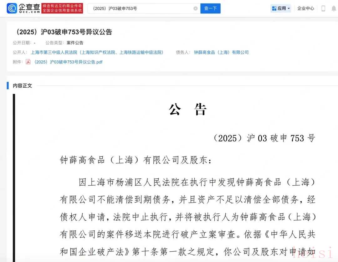 7月16日,鐘薛高食品(上海)有限公司新增破產(chǎn)審查案件,申請(qǐng)人為上海臻料貿(mào)易有限公司,經(jīng)辦法院為上海市第三中級(jí)人民法院。據(jù)案件公告顯示,因法院在執(zhí)行中發(fā)現(xiàn)鐘薛高不能清償?shù)狡趥鶆?wù),并且資產(chǎn)不足以清償全部債務(wù),經(jīng)債權(quán)人申請(qǐng),法院中止執(zhí)行,并將被執(zhí)行人的案件移送進(jìn)行破產(chǎn)立案審查。
