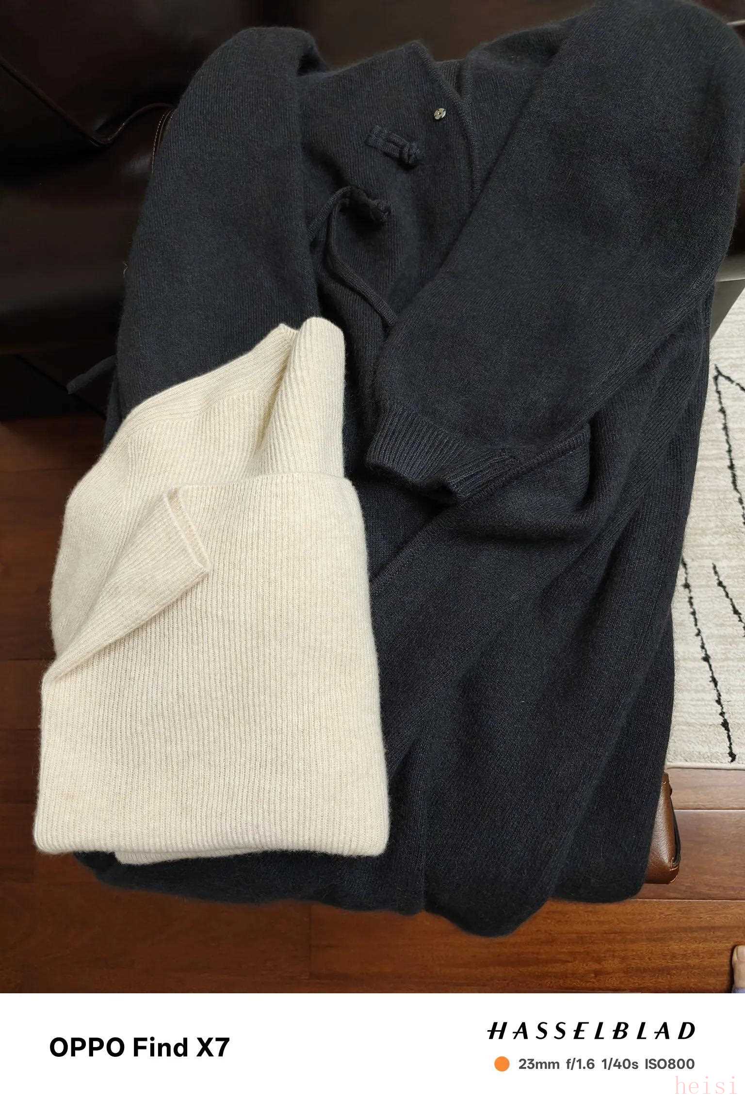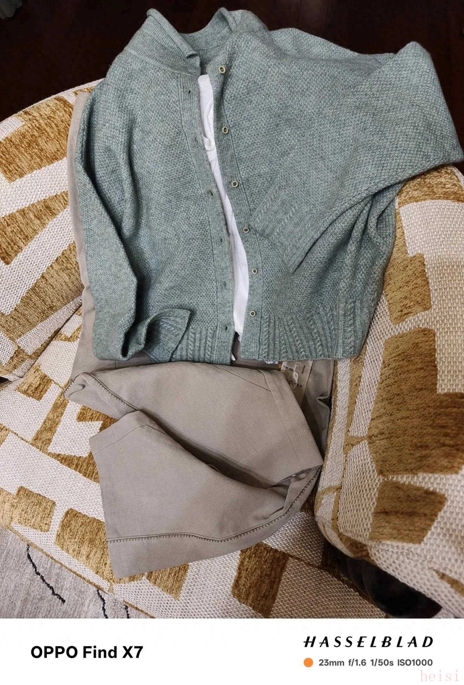第四套:毛衣大外套是我最想買的,又是不知叫啥的英文品牌。我覺得穿著方便,披上就走,但我喜歡純棉的,偏質(zhì)感的,翠微有件羊絨的太過柔軟沒拿,這件先試個(gè)白色的,后買的這件藍(lán)色的,姐說這件顯瘦,看著更高檔,因?yàn)橛屑\色的長(zhǎng)款,就沒再糾結(jié)拿下這件苜?;掖竺馈@锩孢x了一件小毛衫,搭配還可以。