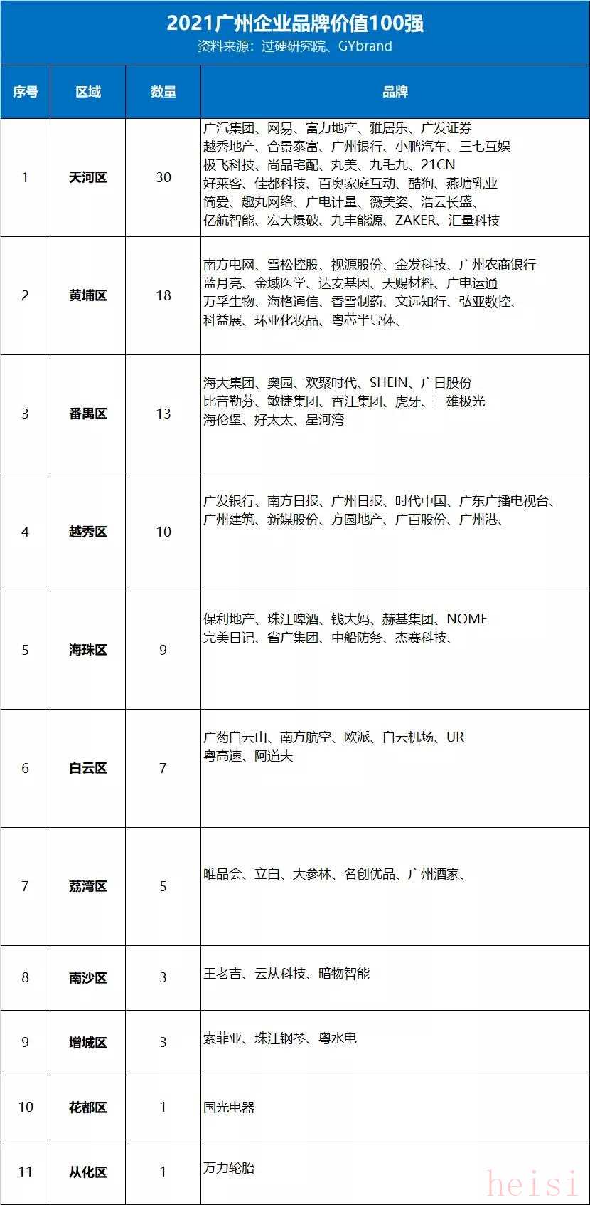 下面是過(guò)硬研究院發(fā)布的“2021廣州最具價(jià)值品牌100強(qiáng)名單”,我們將100個(gè)品牌進(jìn)行區(qū)域劃分: